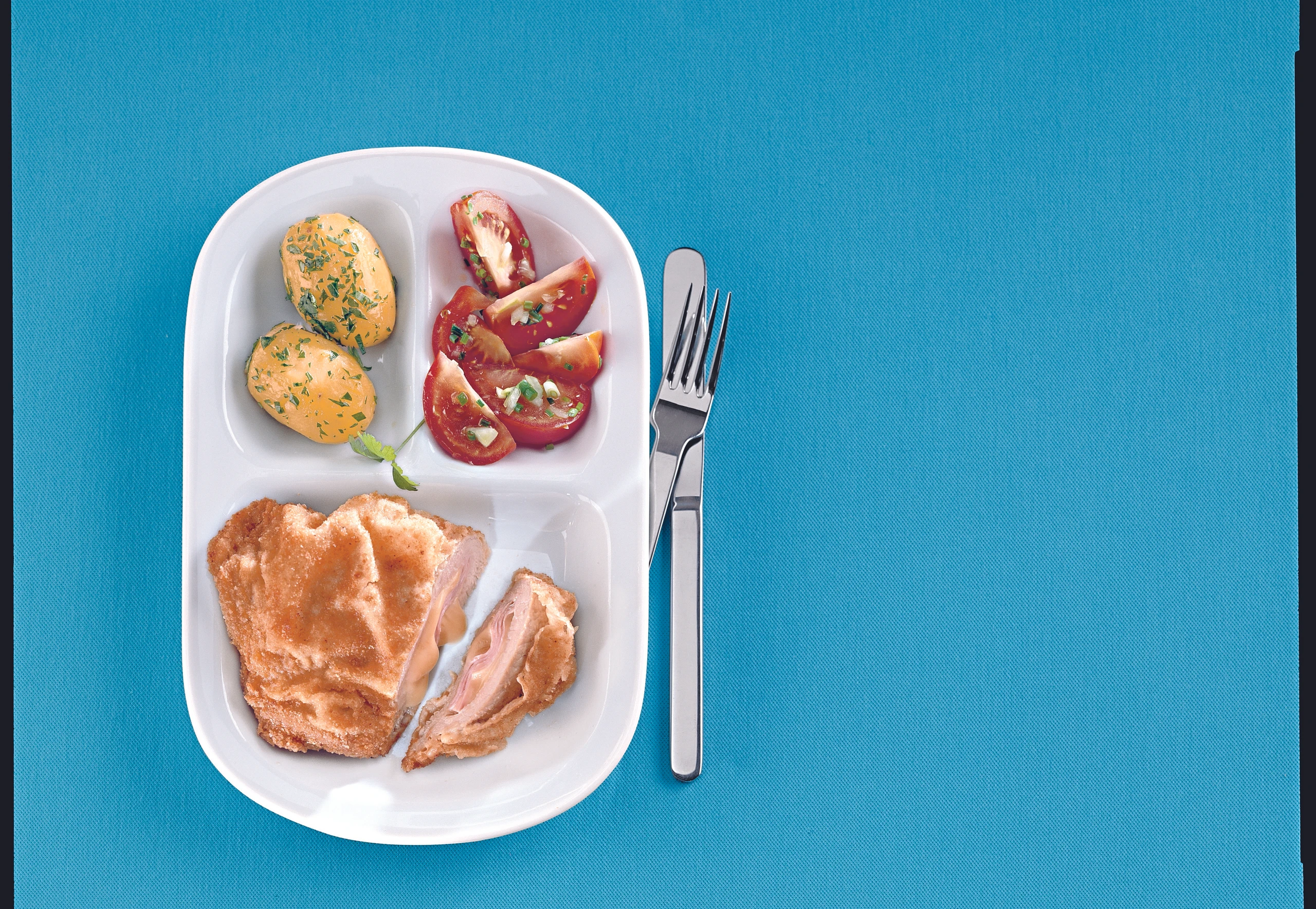 Schnitzel zwischen Frischhaltefolie klopfen, salzen und pfeffern. Auf eine Hälfte jedes Schnitzels 1 Käsescheibe legen, am Rand ca. 2 cm frei lassen. Je 1 Schinken- und Käsescheibe darauf legen. Schnitzel über die Fülle klappen, Ränder zusammendrücken, mit Zahnstochern verschließen. Schnitzel in Mehl, verquirlten Eiern und Bröseln panieren.