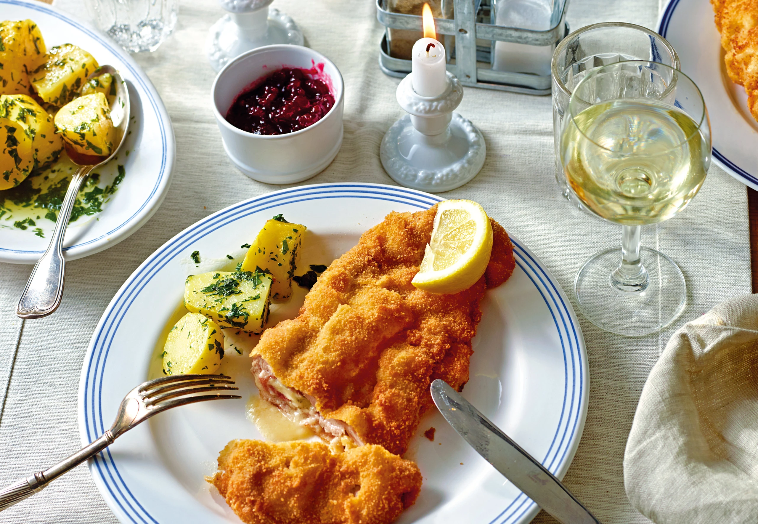 Cordon rouge mit den Erdäpfeln anrichten und mit Zitronenspalten garniert servieren. Dazu passt Preiselbeerkompott.