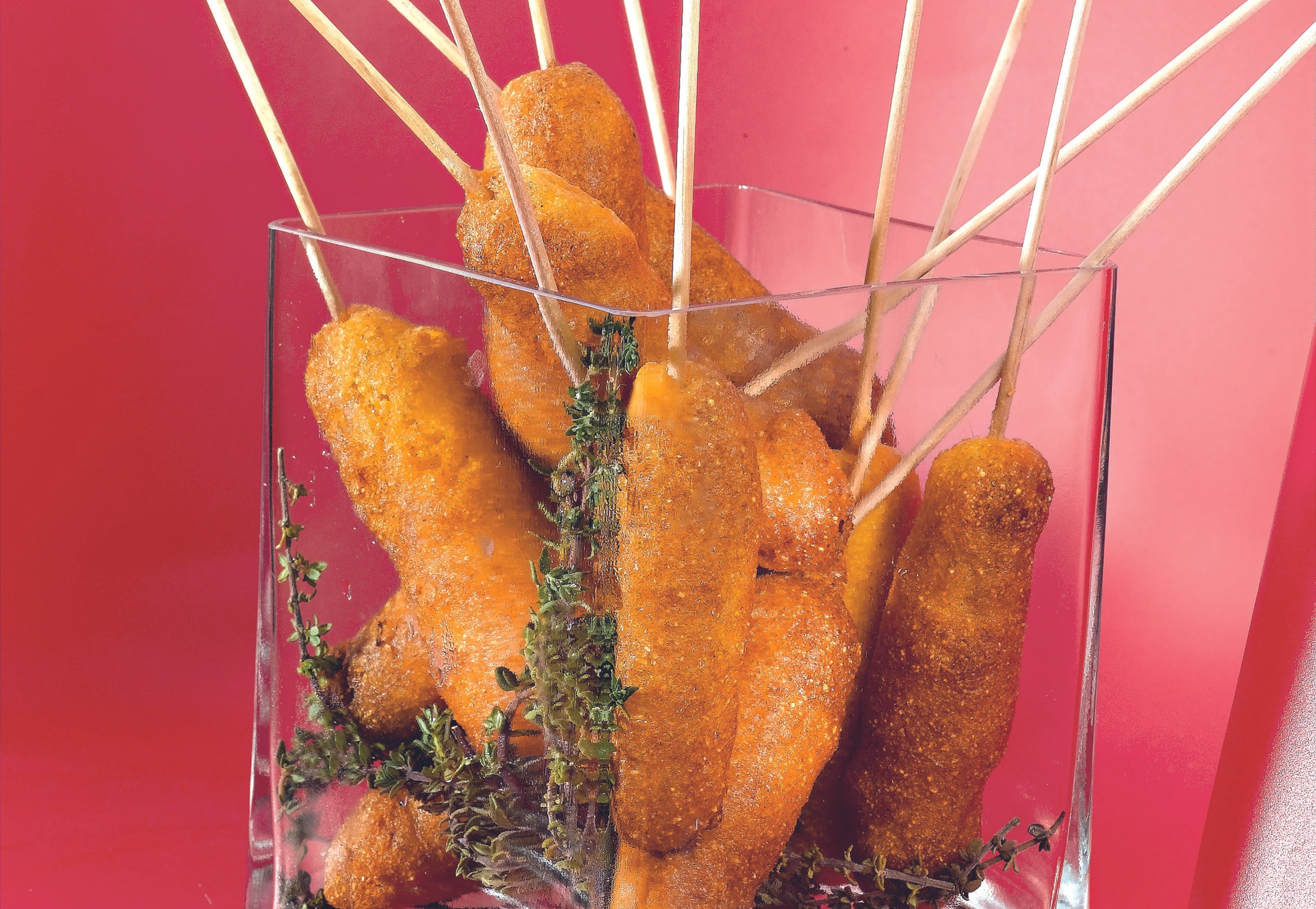 Ca. 30 cm lange Holzspieße in Wasser legen. Würstchen in Mehl wälzen, auf die Spieße stecken und durch den Teig ziehen. In heißem Fett (ca. 170°C) schwimmend knusprig backen. Herausheben und auf mehreren Lagen Küchenpapier abtropfen lassen.