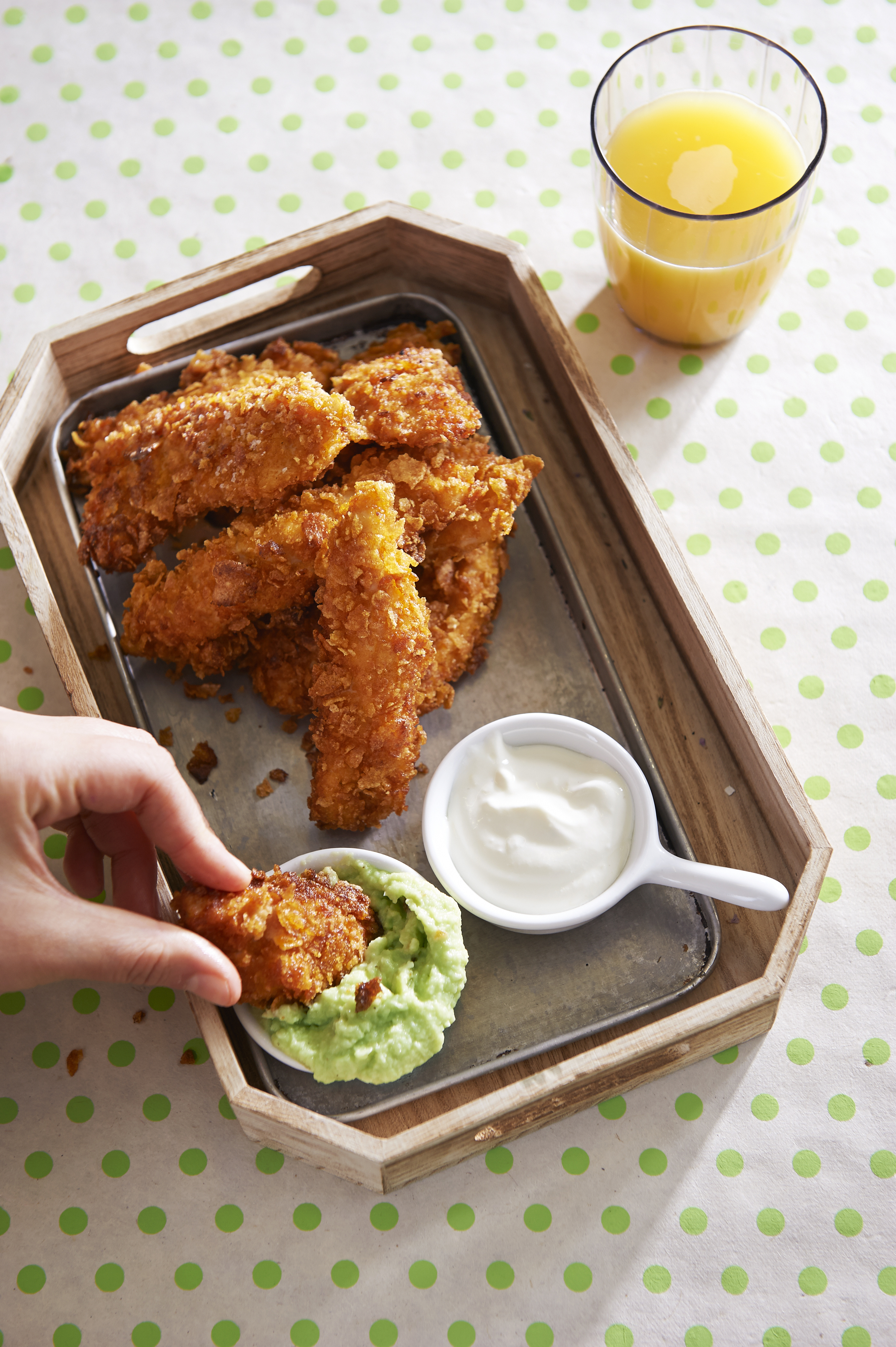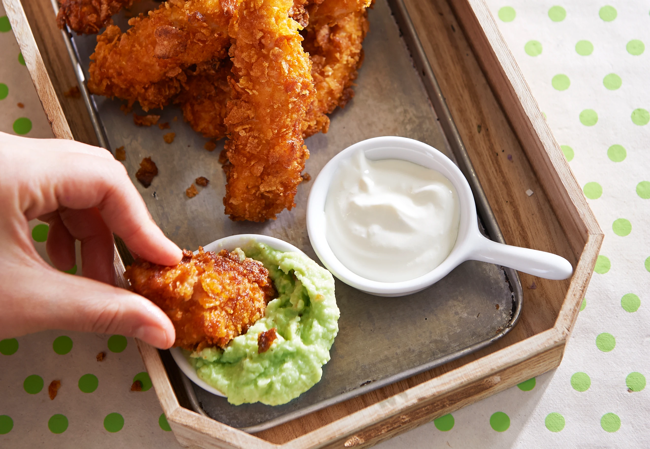 Cornflakes Chicken Fingers mit Sauerrahm-Dip und Avocado-Dip