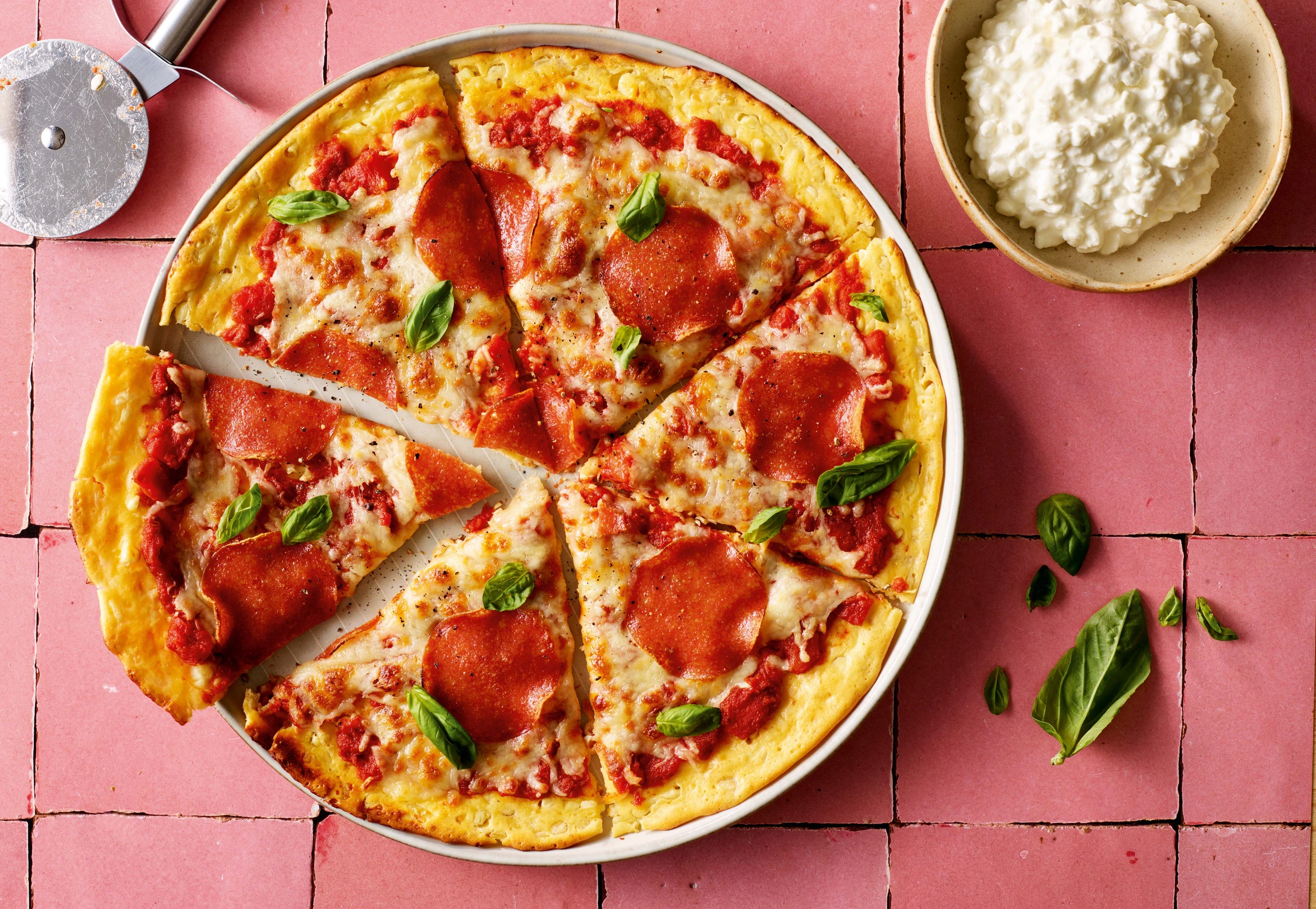 Gusto-Tipp: Die Pizza lässt sich beliebig belegen, jedoch nicht zu viel Belag wählen, da der Teig dünn ist und Stabilität verlieren könnte.