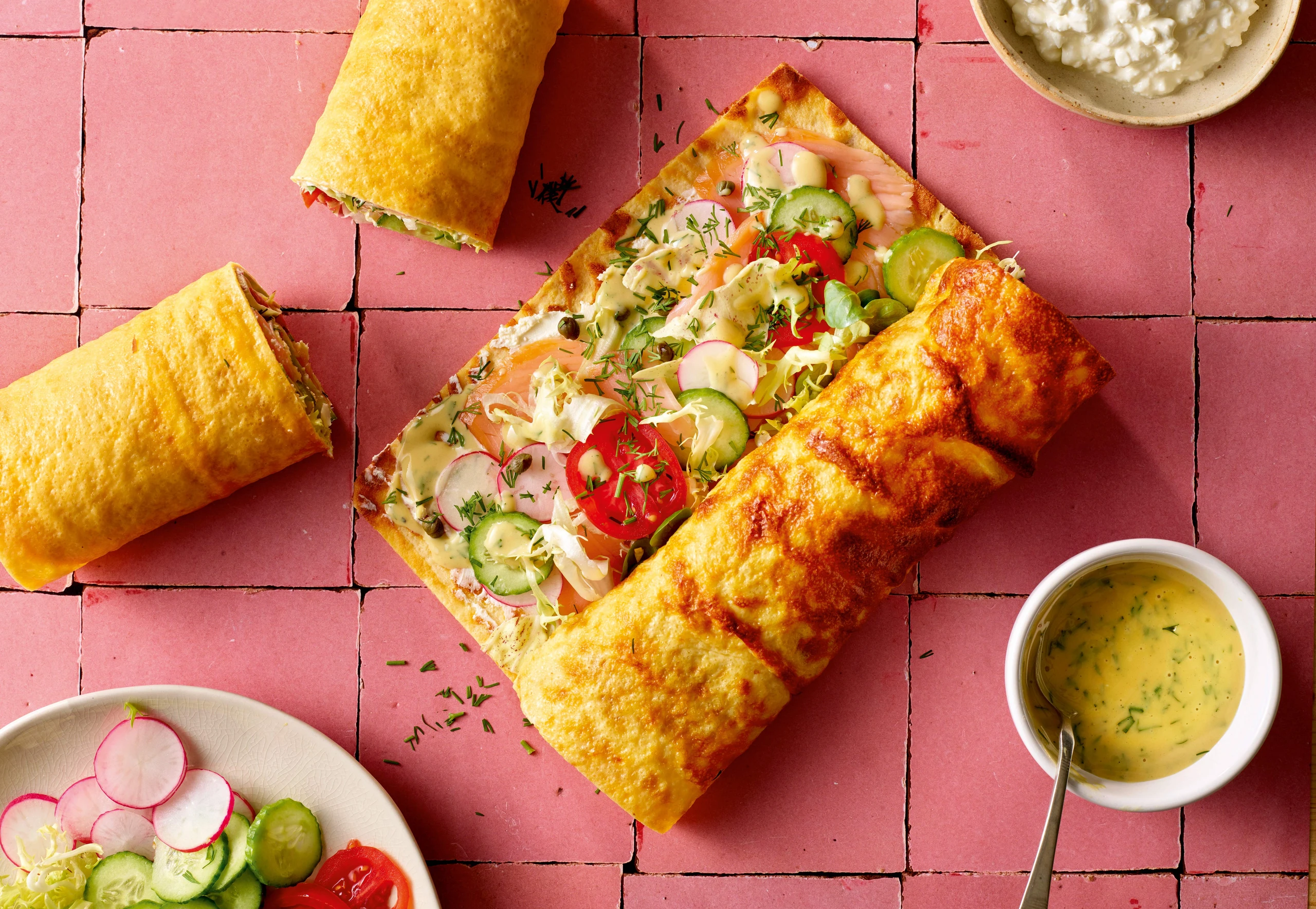 Wenn der Wrap ausgekühlt ist, eventuell dunkle Ränder wegschneiden, sodass ein Rechteck mit geraden Kanten entsteht. Wrap mit Frischkäse bestreichen und mit Lachs, Salat, Paradeisern, Gurken, Radieschen und Kapern belegen. Mit Sauce beträufeln, mit Salz, Pfeffer und Dille würzen und aufrollen.