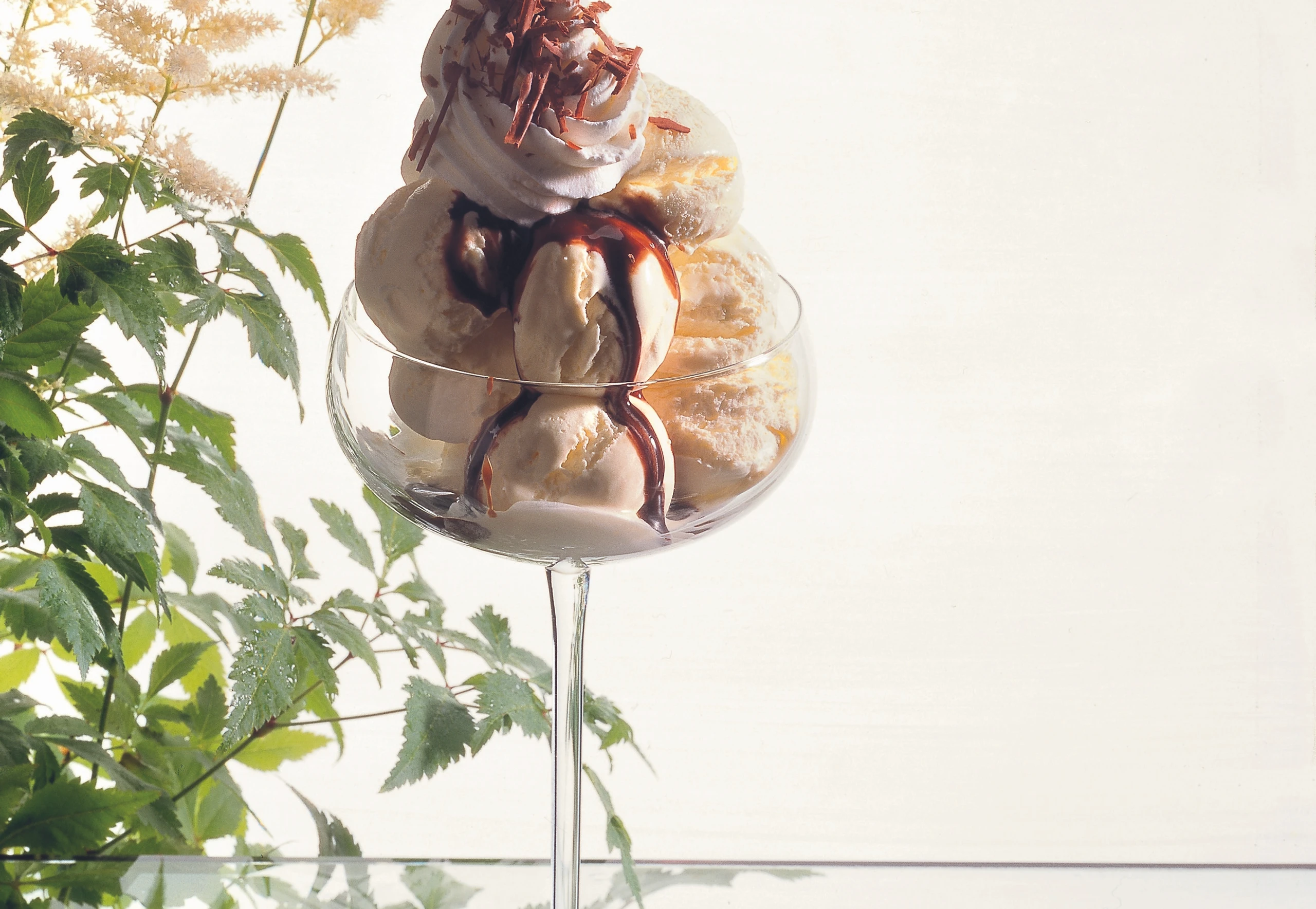 Vanilleeis in gekühlten Gläsern anrichten. Schokoladesauce über das Eis gießen und mit Schlagobers dekorativ garnieren (mit Hilfe eines Dressiersackes oder noch besser eines Schlagobersautomaten, in dem man geschlagenes Obers bis zu ca. 1 Woche aufbewahren kann). Besonders hübsch sieht der Eisbecher aus, wenn man das Schlagobers mit Schokoladespänen bestreut.