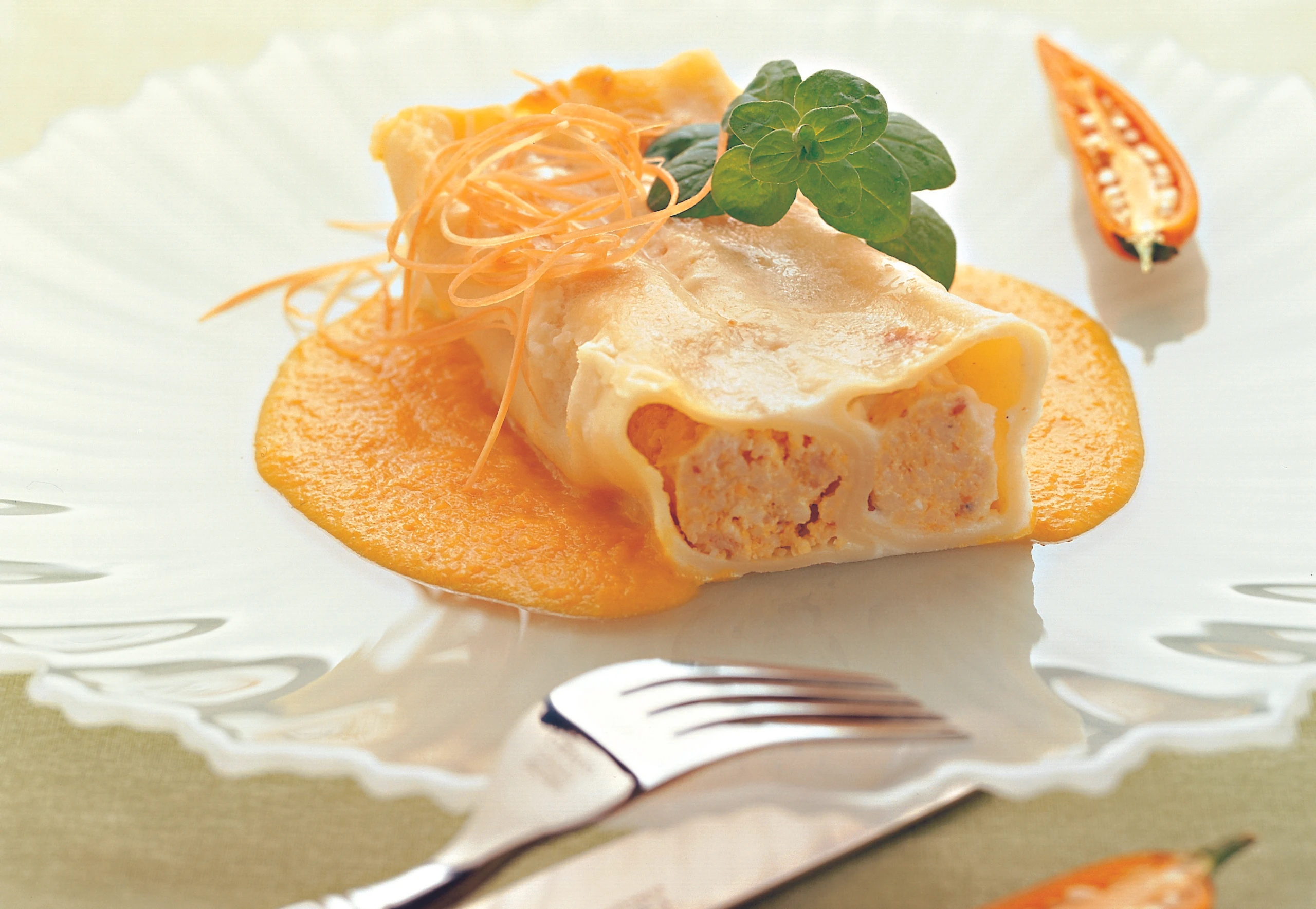 Couscous-Cannelloni mit Huhn, Chili und Karotten-Orangen-Sauce