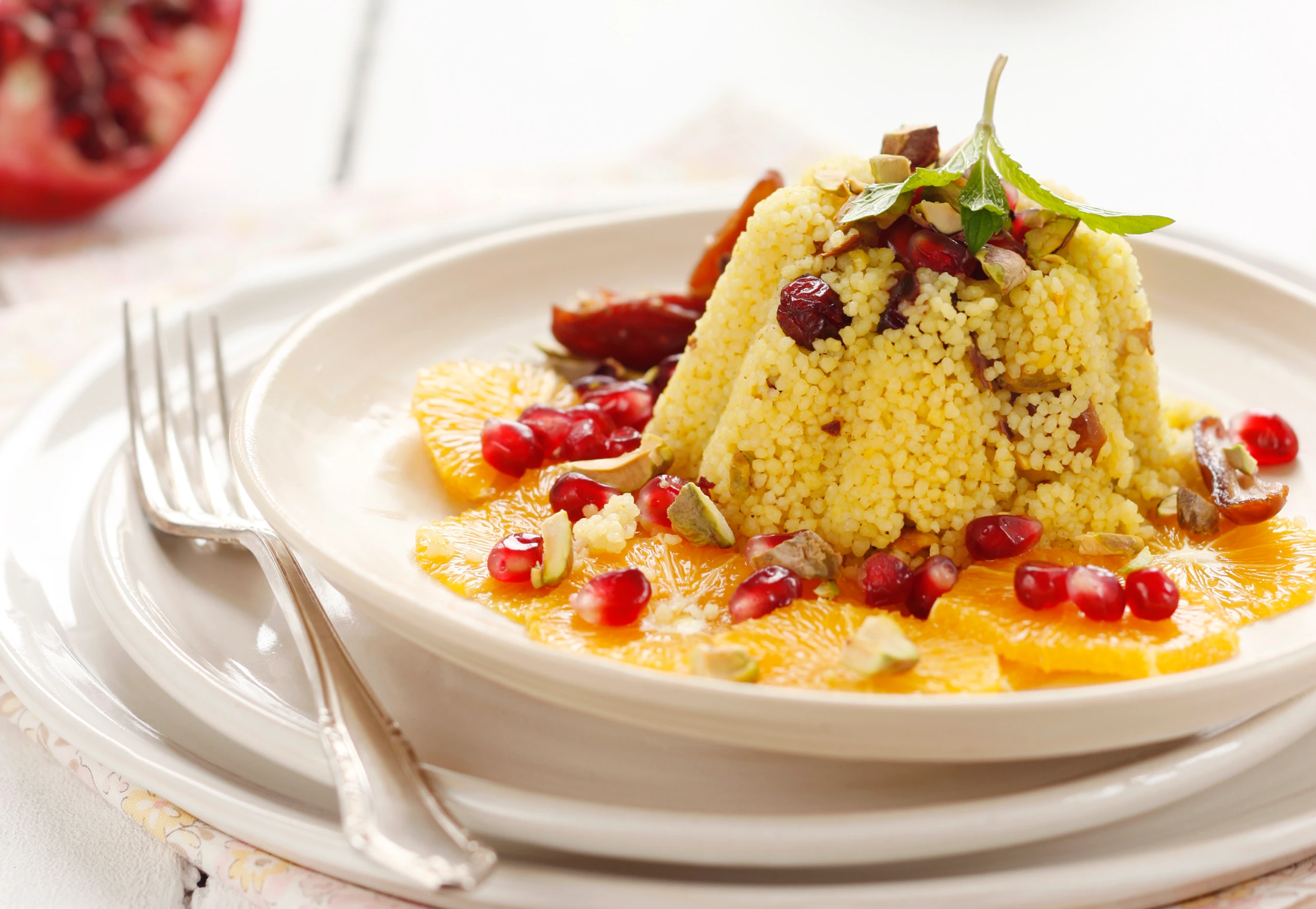 Orangenscheiben auf Tellern anrichten. Couscous mit Pistazien und Datteln vermischen, in ein Förmchen drücken und auf die Orangen stürzen. Mit Granatapfelkernen und Minze garnieren. Mit Ahornsirup beträufeln.