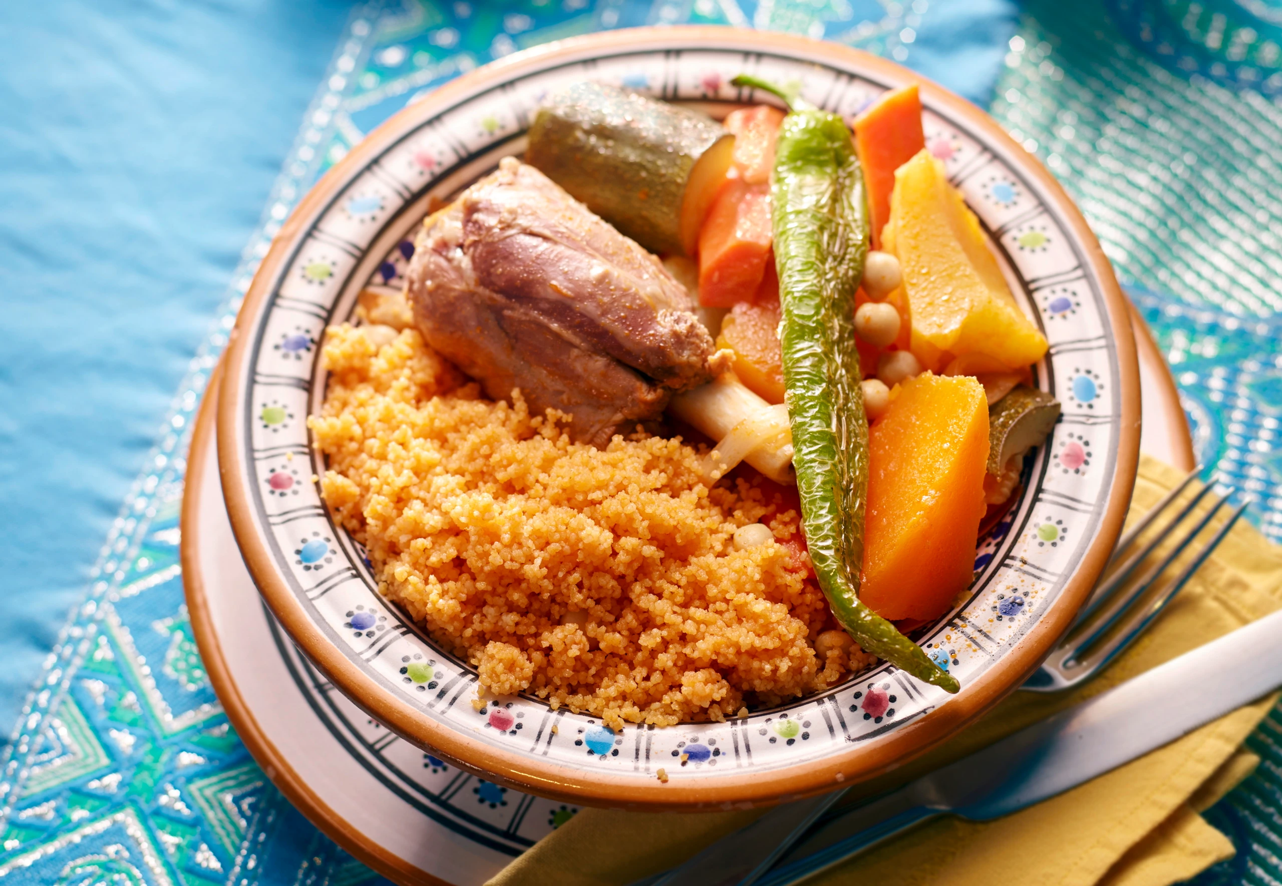 Dämpfeinsatz auf den Fleischtopf setzen, Couscous hineingeben, mit wenig Wasser, 1 TL Salz und 1 EL Olivenöl vermischen, zudecken, Flüssigkeit im Topf aufkochen.