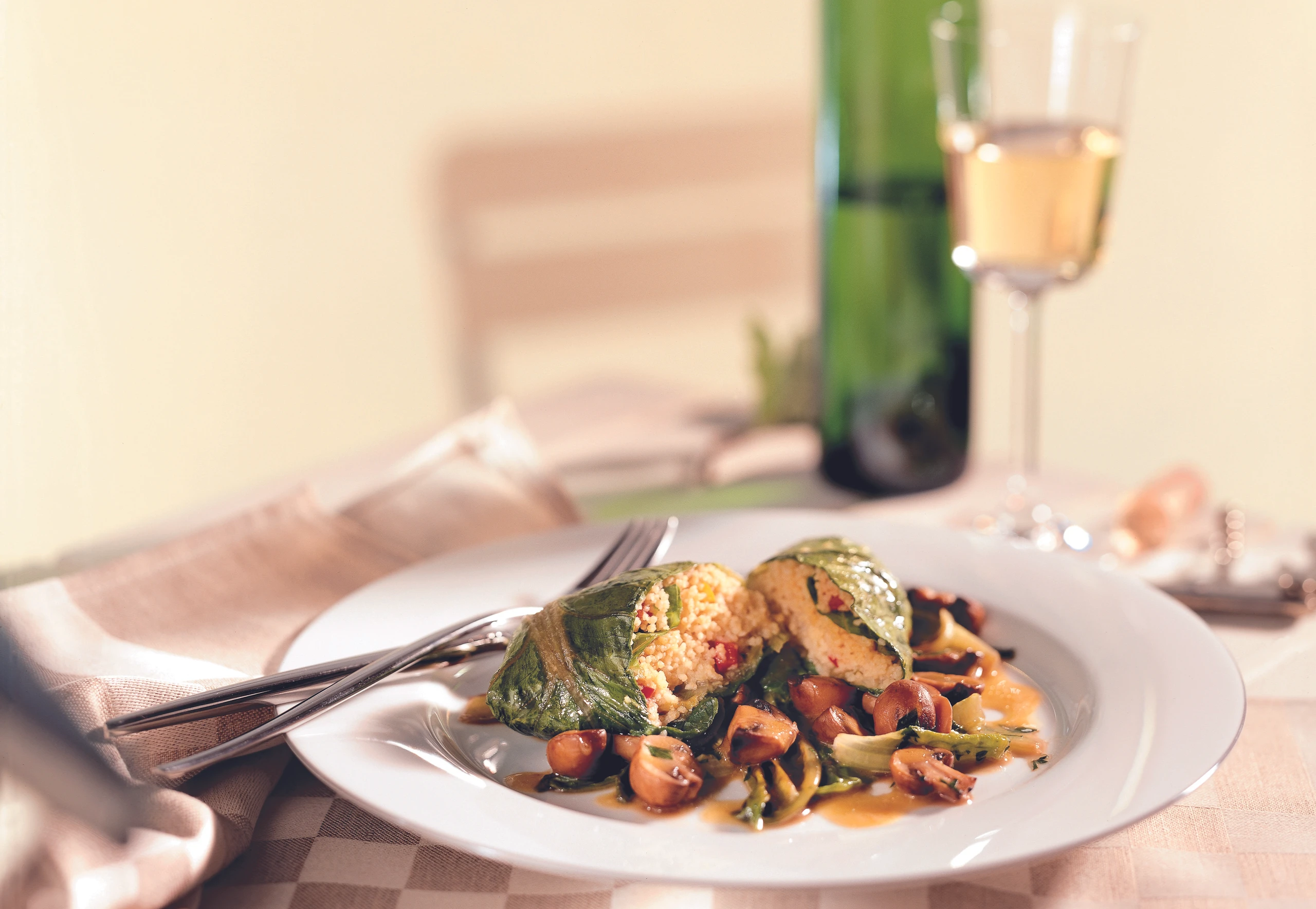Couscous-Rouladen mit Kochsalat und glasierten Pilzen