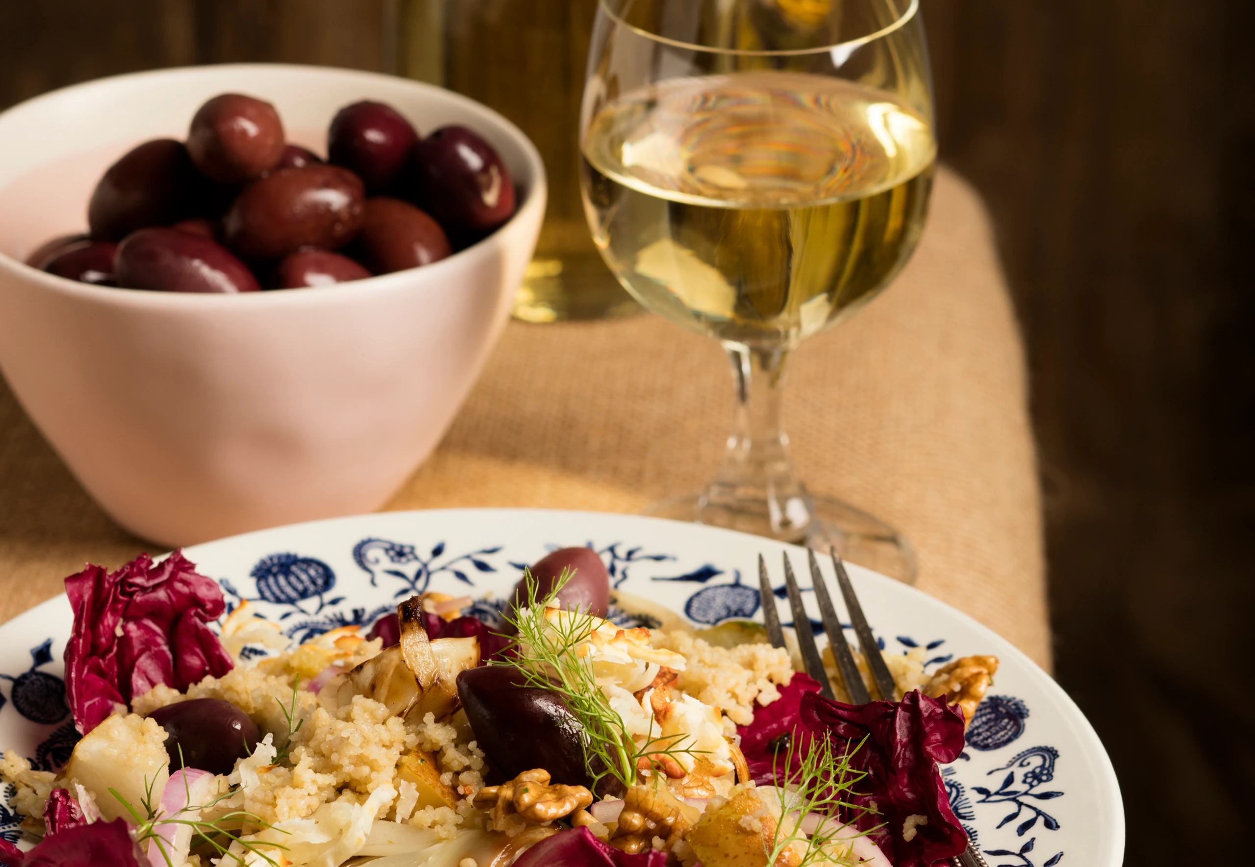 Für die Marinade Essig salzen, pfeffern und mit dem übrigen Öl vermischen. Knoblauch zugeben. Couscous mit Fenchel, Zwiebeln, Nüssen, Oliven, Birnen, Radicchio, Fenchelgrün und Marinade vermischen und ca. 5 Minuten ziehen lassen. Couscous mit Halloumi vermischen und anrichten.