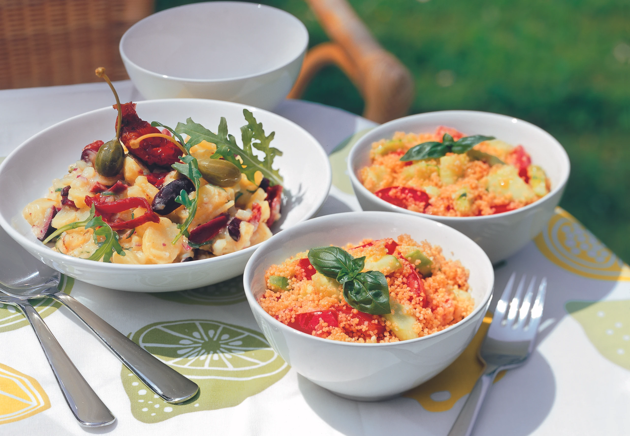 Couscous, Öl, Tomaten, Schalotten, Knoblauch, Zitronensaft, Fond, Salz und Pfeffer vermischen und mindestens 2 Stunden ziehen lassen.