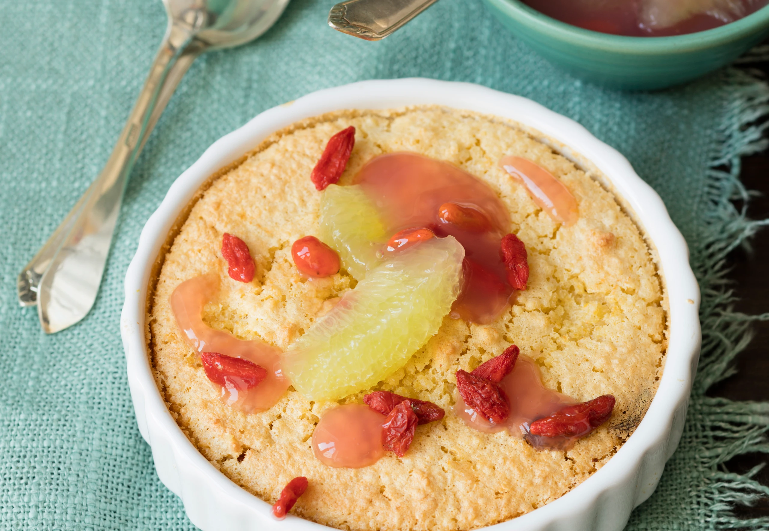 - Butter, Dotter, Gojibeeren und Rosenwasser in die Couscousmasse rühren. Eiklar mit Zucker zu cremigem Schnee schlagen und unterheben. Masse in die Förmchen füllen und im Rohr (untere Schiene / Gitterrost) ca. 15 Minuten backen. Aufläufe mit der Sauce servieren.