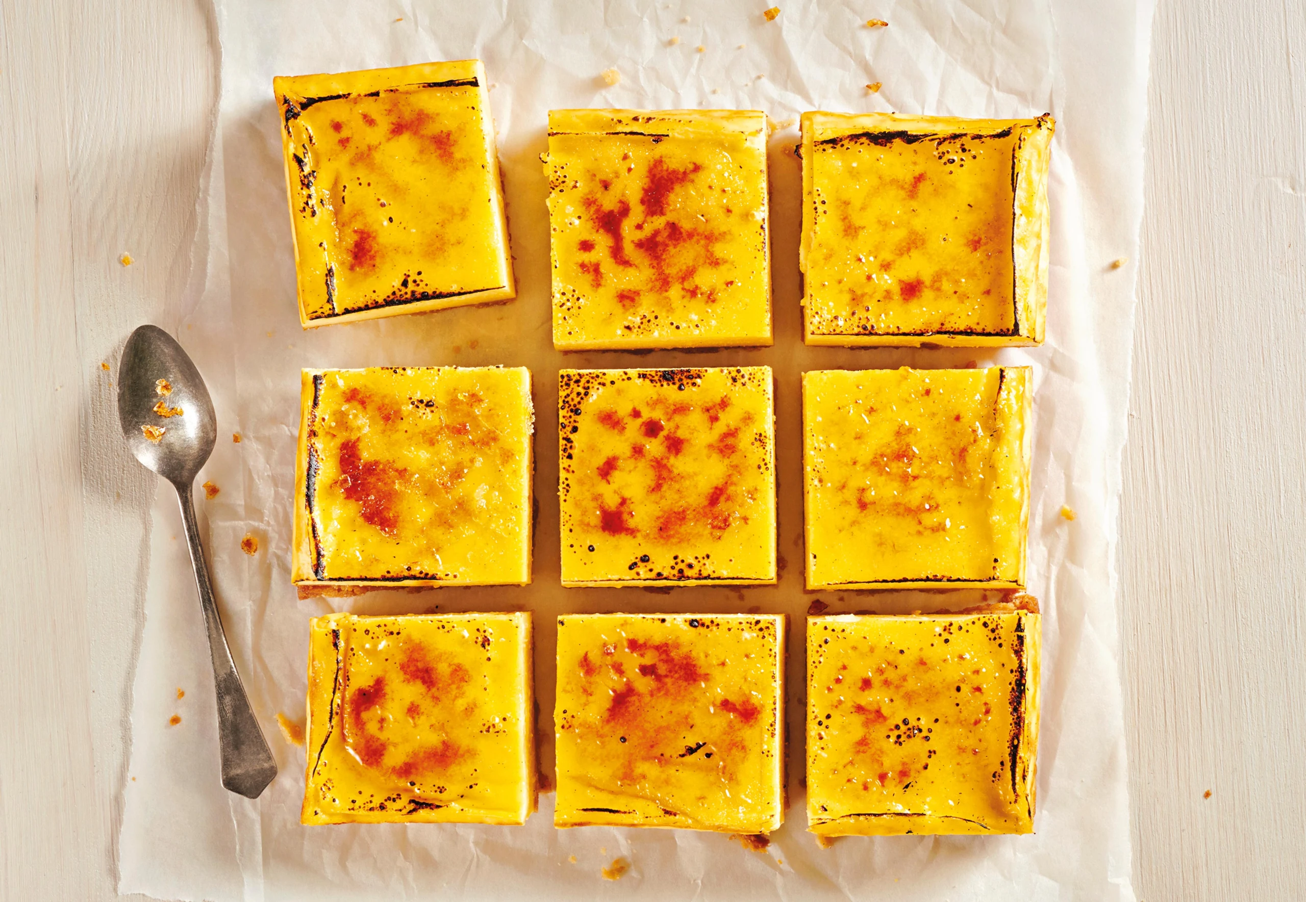 Schnitte in 9 Stücke schneiden und mit je 1 TL Kristallzucker bestreuen. Mit einem Bunsenbrenner abflämmen.