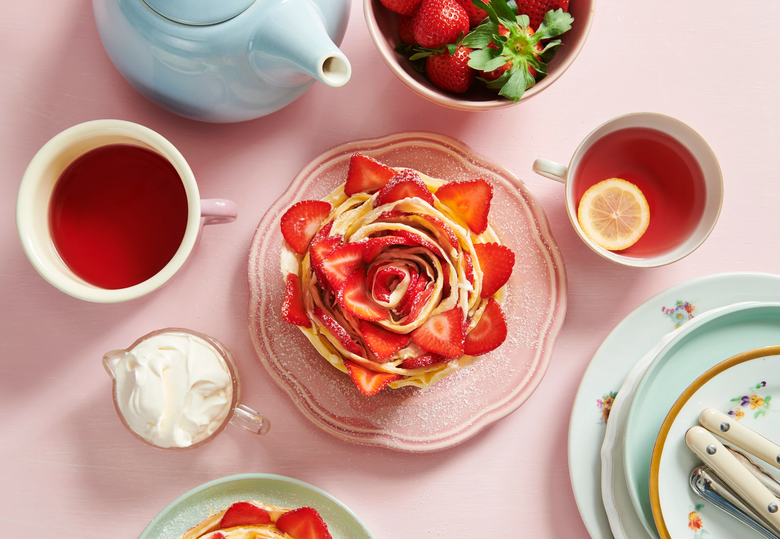 Pro Törtchen 8 Palatschinken halbieren. Hälften nochmal halbieren, sodass 4 Streifen entstehen. Jeweils 2 Streifen überlappend der Länge nach auf die Arbeitsfläche legen und mit 1 EL von der Creme bestreichen. Jeden zweiten Streifen mit Erdbeeren belegen. Eng einwickeln und weitere Streifen dazurollen, bis das Törtchen fertig ist. Gebogene Teigstreifen einzeln an den Rand der Törtchen drücken und in Blütenform ziehen.