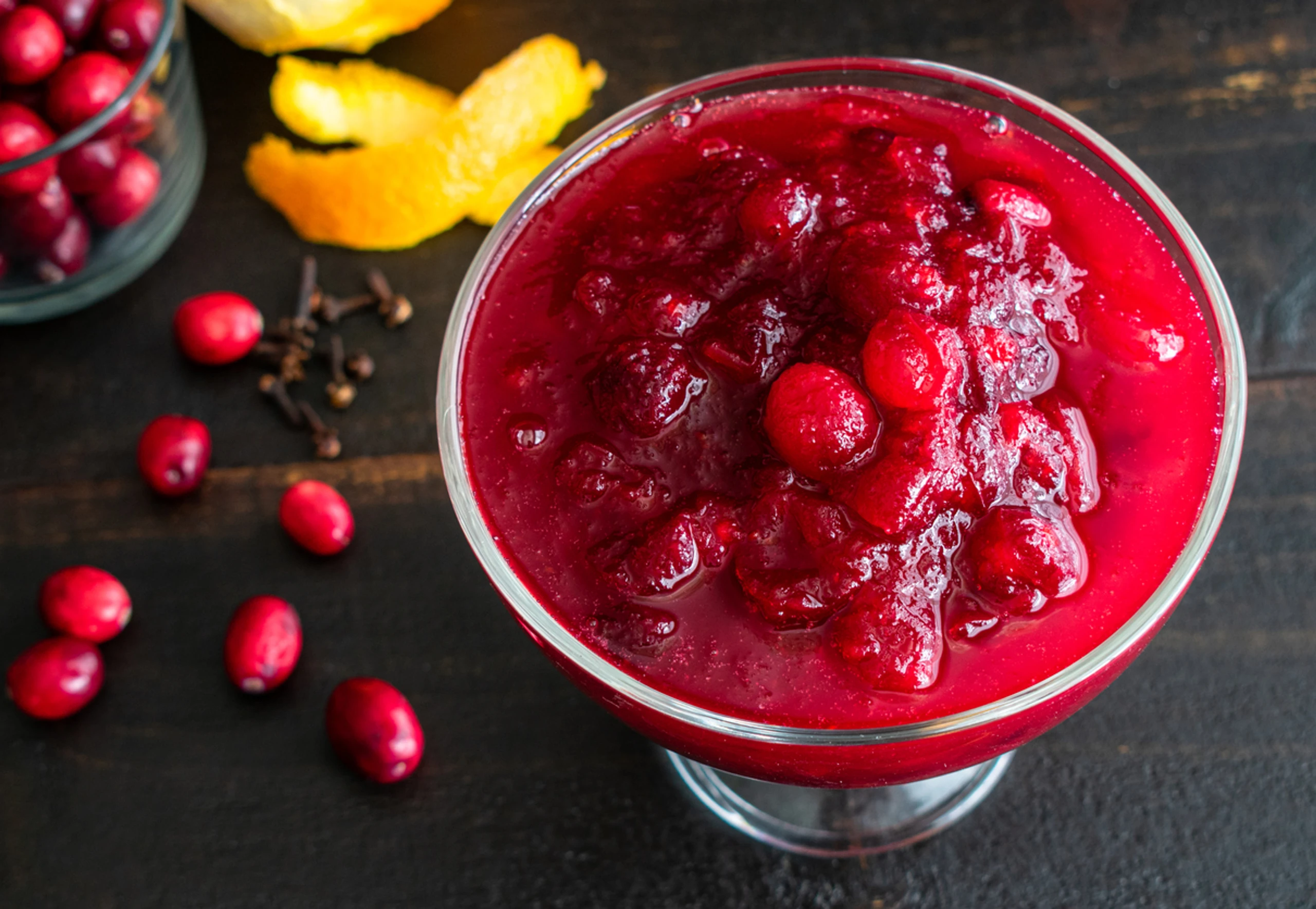 Cranberries mit braunem Zucker, Orangenschale, Wasser und Nelke aufkochen. Früchte ca. 8 Minuten köcheln.