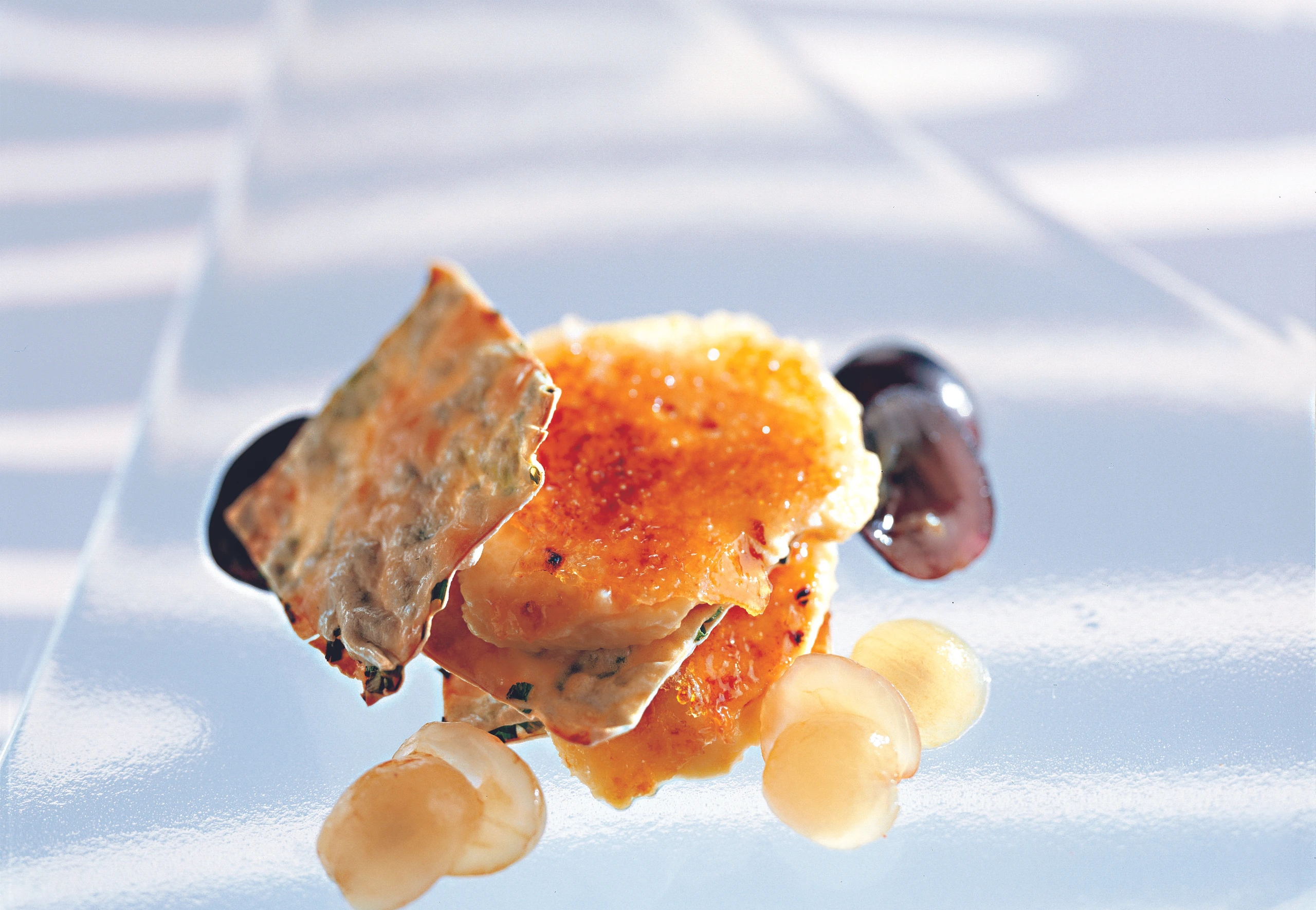 Crème aus der Form stürzen, mit Zucker bestreuen und flämmen, bis die Oberfläche karamellisiert. Crème brûlée in Scheiben schneiden und abwechselnd mit den Knusperblättern anrichten. Dazu passen Weintrauben.