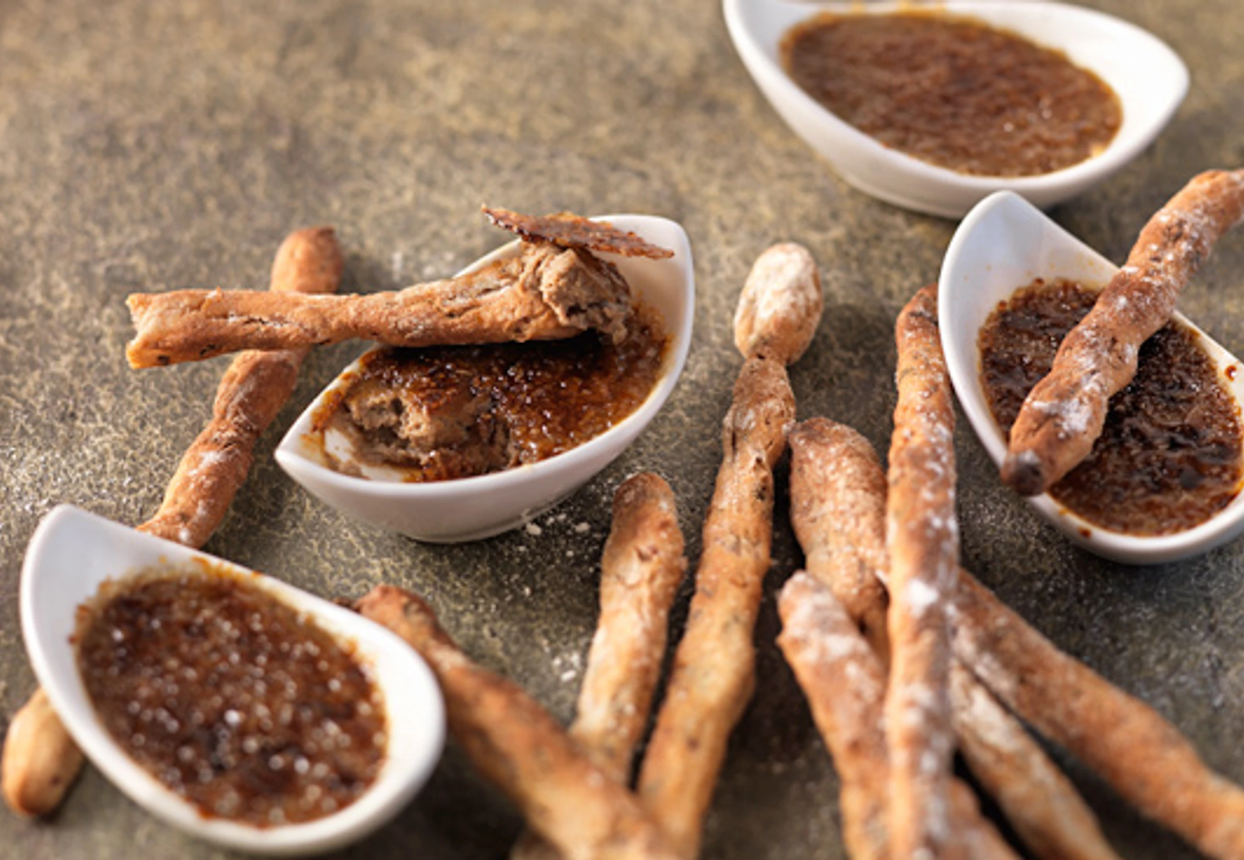 - Cremen mit Braunzucker bestreuen, mit einem ?Brenner? flämmen. Als Beilage serviert man Vollkorn-Grissini oder getoasteten Brioche.