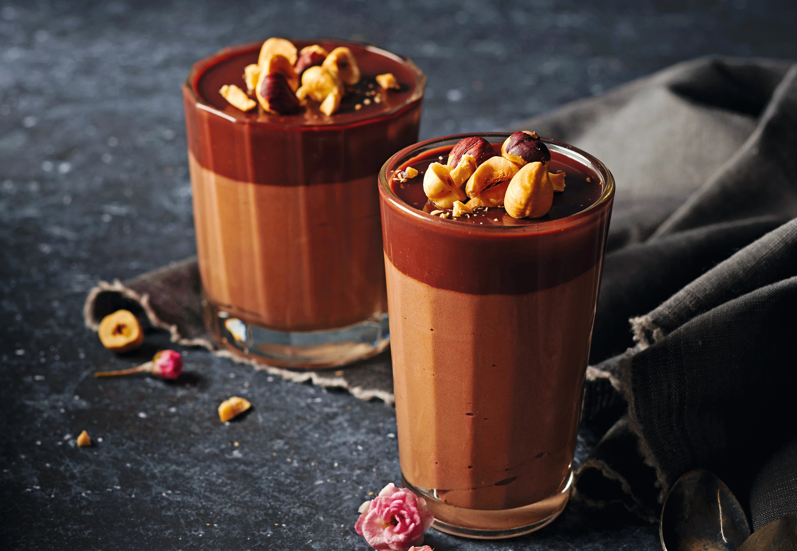 Rohr auf 200°C vorheizen. Nüsse auf einem Blech verteilen und rösten, bis sie duften und die Schale aufspringt (dauert ca. 10 Minuten). Herausnehmen und noch heiß schälen. Nüsse abkühlen lassen. Die Hälfte der Nüsse fein, die übrigen grob hacken. Obers cremig mixen. Kuvertüremischung und fein gehackte Nüsse unterrühren. Creme in Gläser füllen.