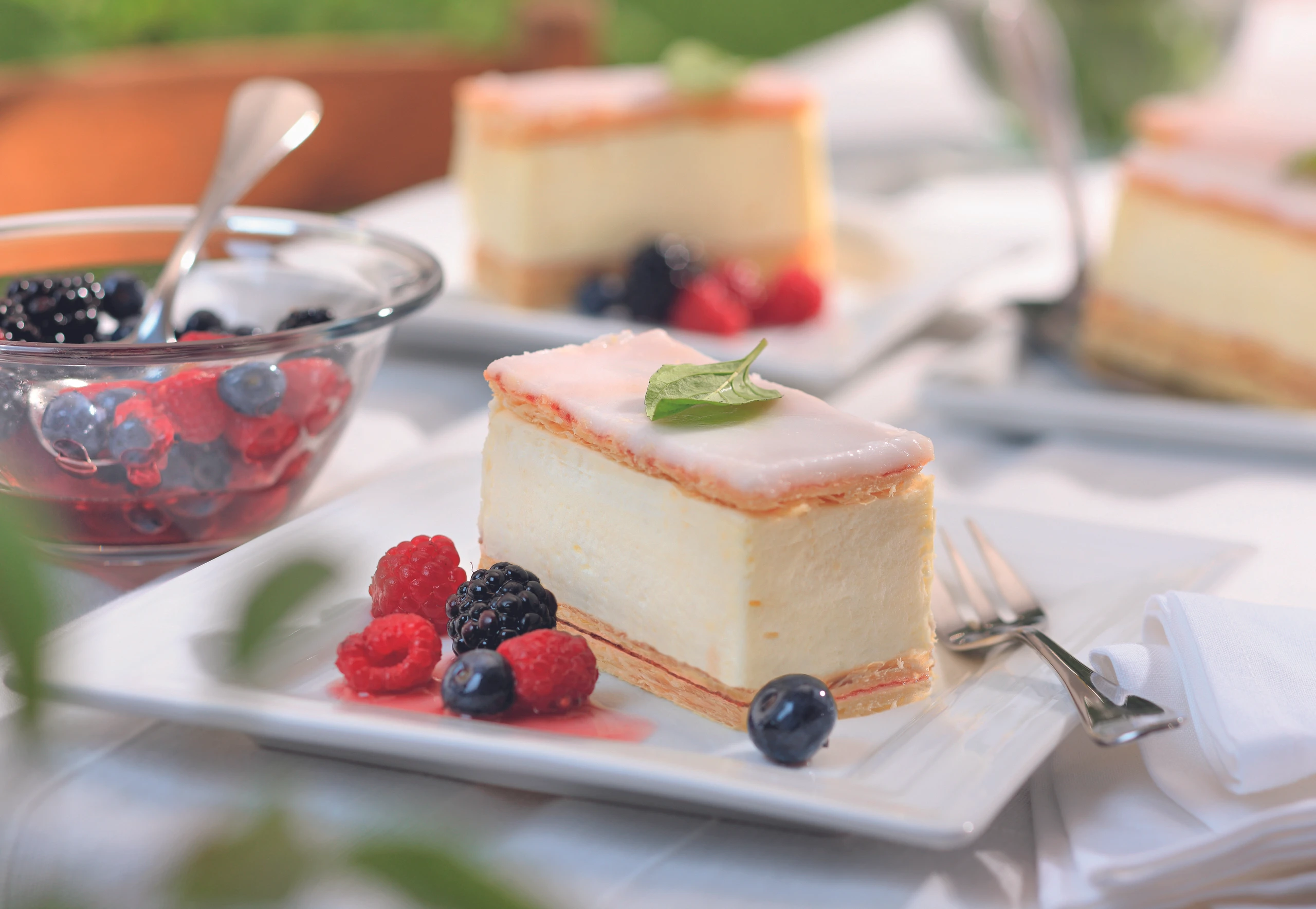 - Cremeschnitte vom Formenrand schneiden. Form abheben. Deckel mit einem Sägemesser sechsteln und auf die Creme legen. Schnitte por-tionieren, mit den Beeren servieren.