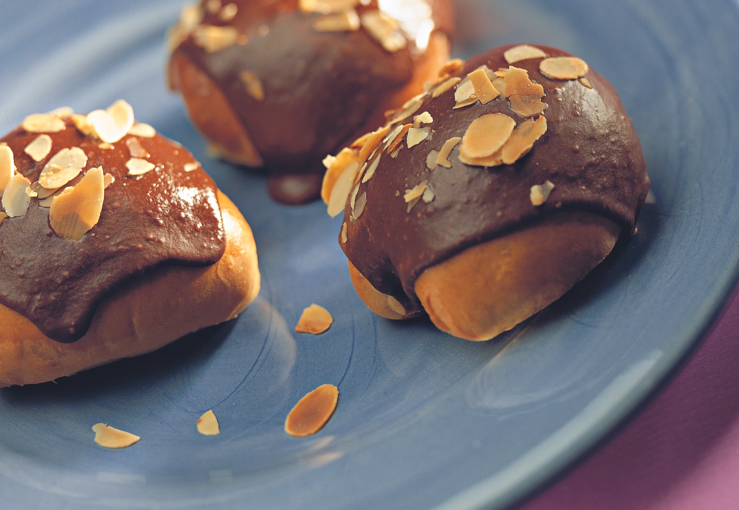 - Die Brioches aus dem Rohr nehmen, noch warm mit der Glasur überziehen und mit Mandeln bestreuen. Glasur fest werden lassen.