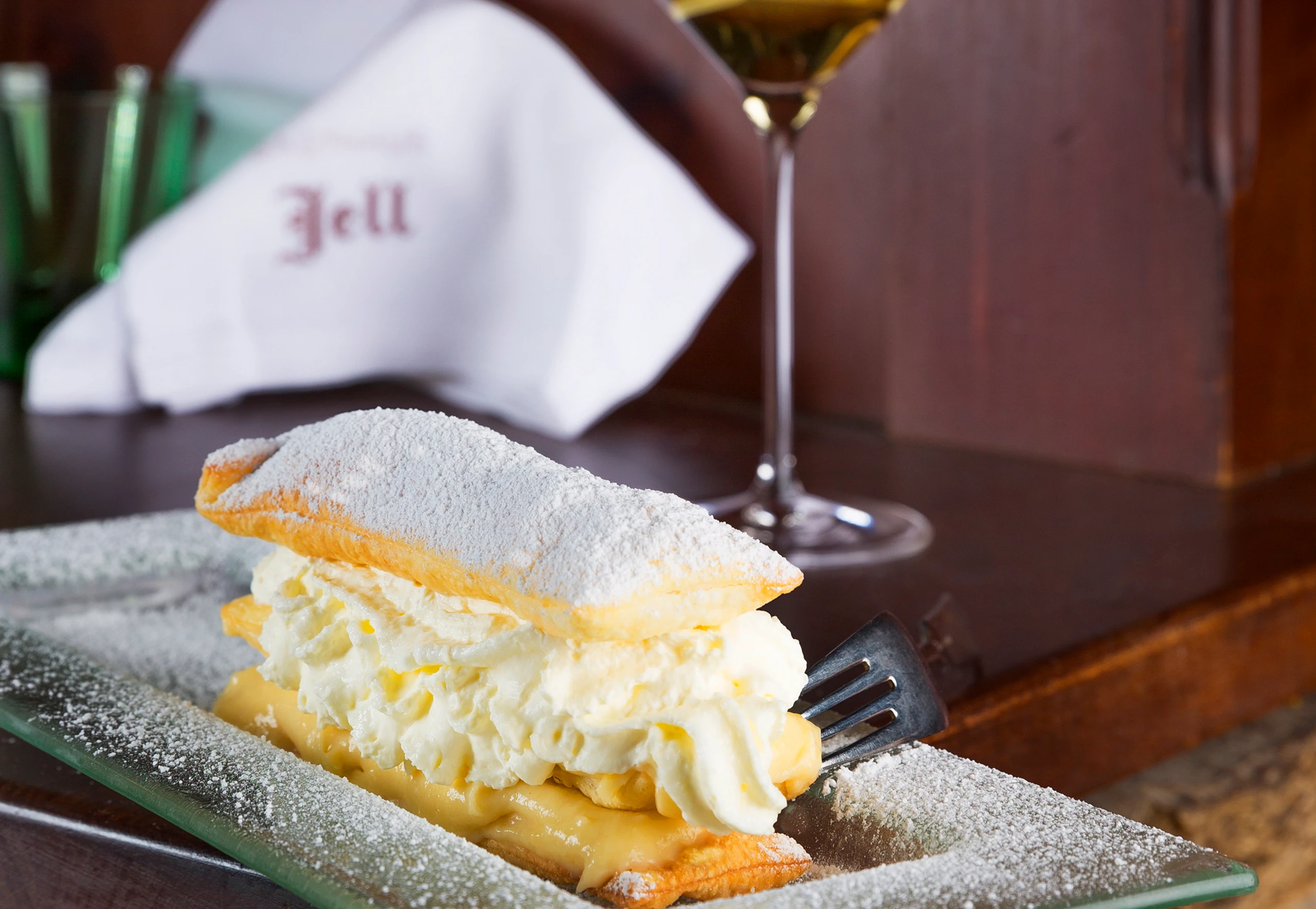 - Für die Garnitur übriges Obers schlagen. Obers und Creme getrennt in Dressiersäcke füllen. Auf 8 von den Teigstücken einen Streifen Creme dressieren, jeweils 2 Stücke übereinandersetzen. Ein Schicht Obers auf die Creme dressieren, übrige Teigstücke daraufsetzen und behutsam andrücken. Schnitte mit Staubzucker bestreut servieren.