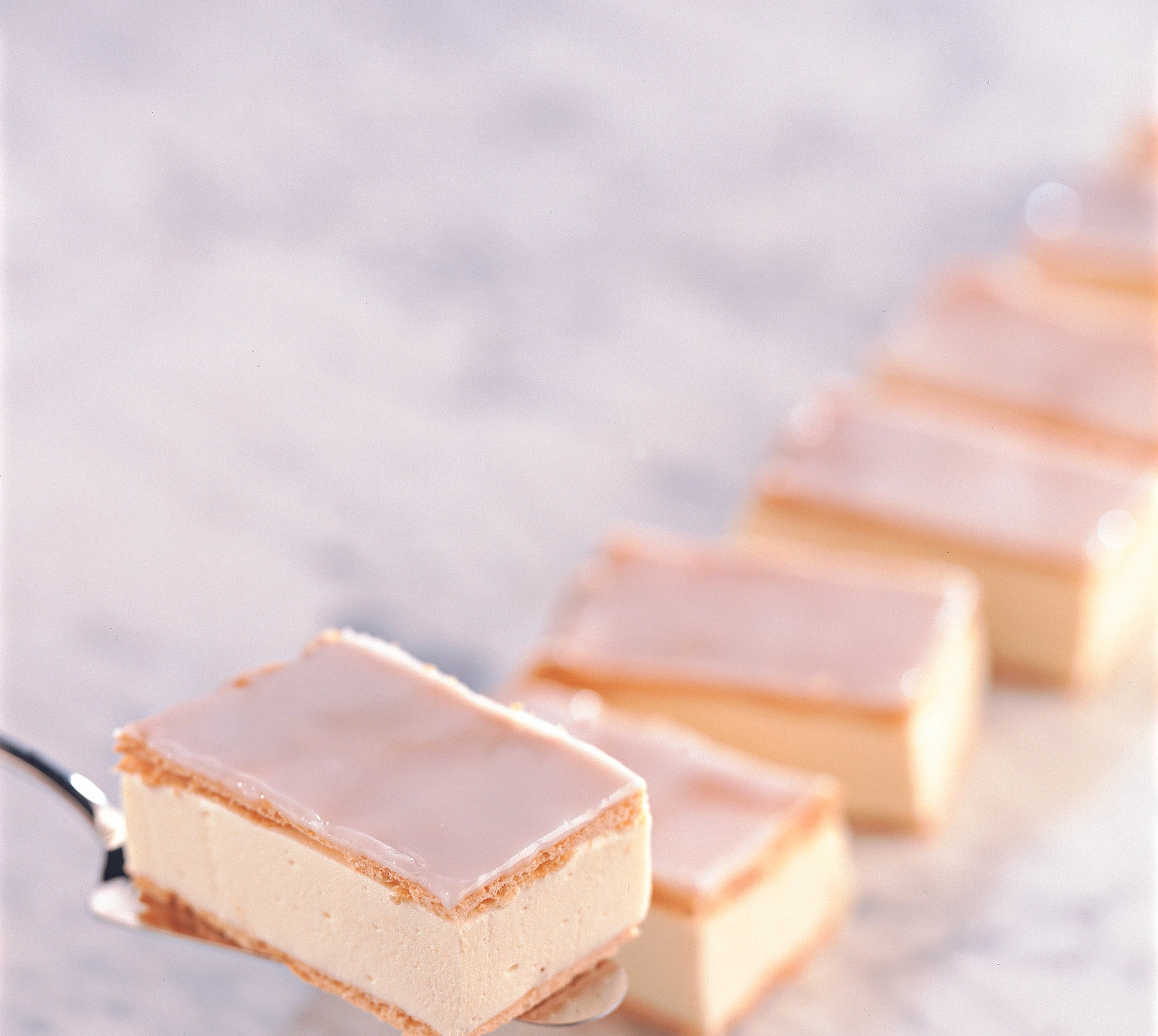 Eine Teighälfte samt Papier auf ein Brettchen legen. Eine Rahmenform (20 x 24 cm) darauf stellen, Teig passend zuschneiden. Creme einfüllen und verstreichen. Schnitte für ca. 4 Stunden kühl stellen.