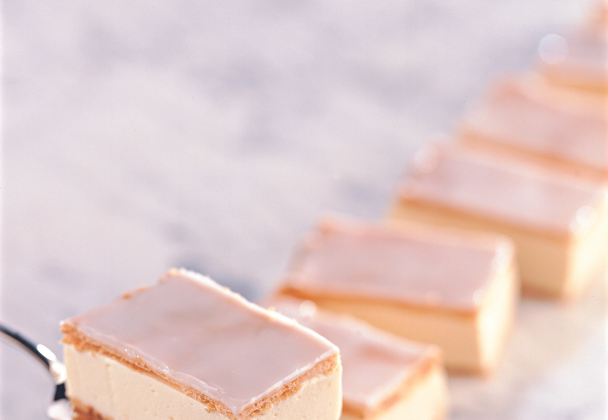 Schnitte rundum vom Formenrand schneiden. Form abheben. Teig mit einem Sägemesser in 10 x 6 cm große Stücke schneiden, und auf die Creme legen. Schnitte portionieren.