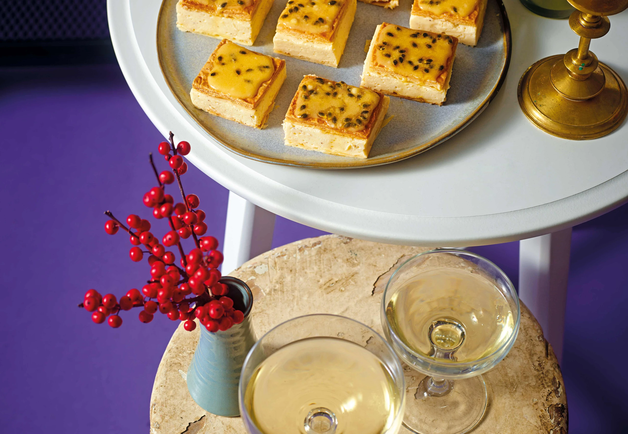 Backblech mit Backpapier belegen. Zweiten Blätterteig aufrollen und in 28 Quadrate schneiden. Auf das Blech legen, mit einem Bogen Backpapier belegen, mit einem zweiten Blech beschweren und im Rohr ca. 25 Minuten goldbraun backen. Herausnehmen und auskühlen lassen.