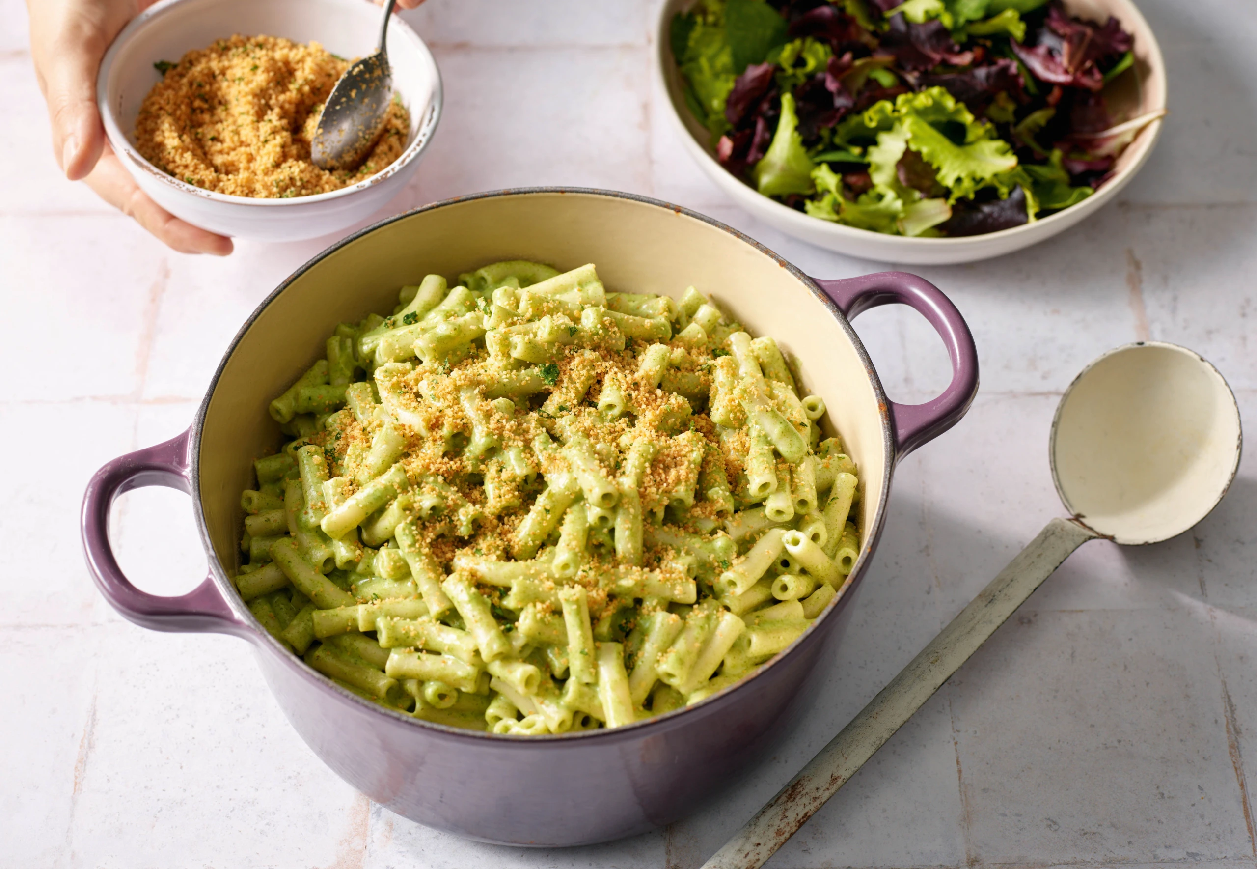 Cremespinat-Mac-and-Cheese mit Knoblauchbröseln