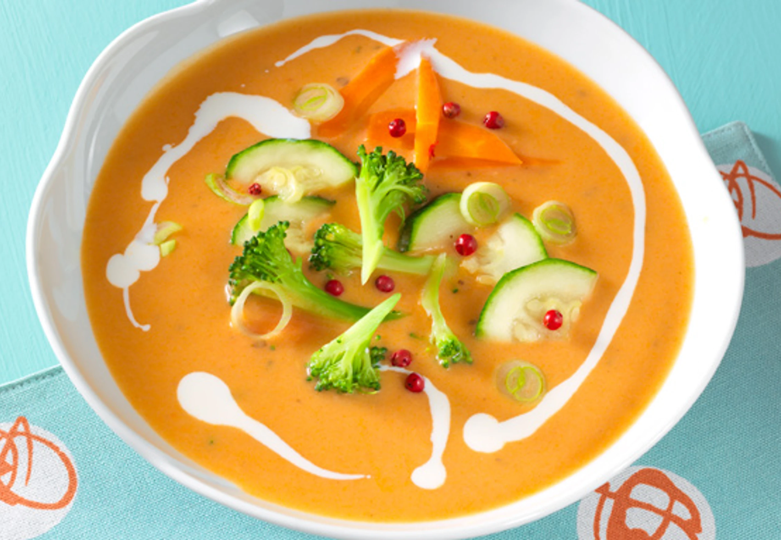 - Restliche Gemüsesuppe aufkochen. Karotten und Brokkoli einlegen und ca. 3 Minuten köcheln. Zucchini zugeben und kurz mitkochen. Alles mit der Cremesuppe vermischen, salzen, pfeffern, mit Jungzwiebeln und Rosa Beeren bestreut servieren. Eventuell mit Sojacreme verfeinern.