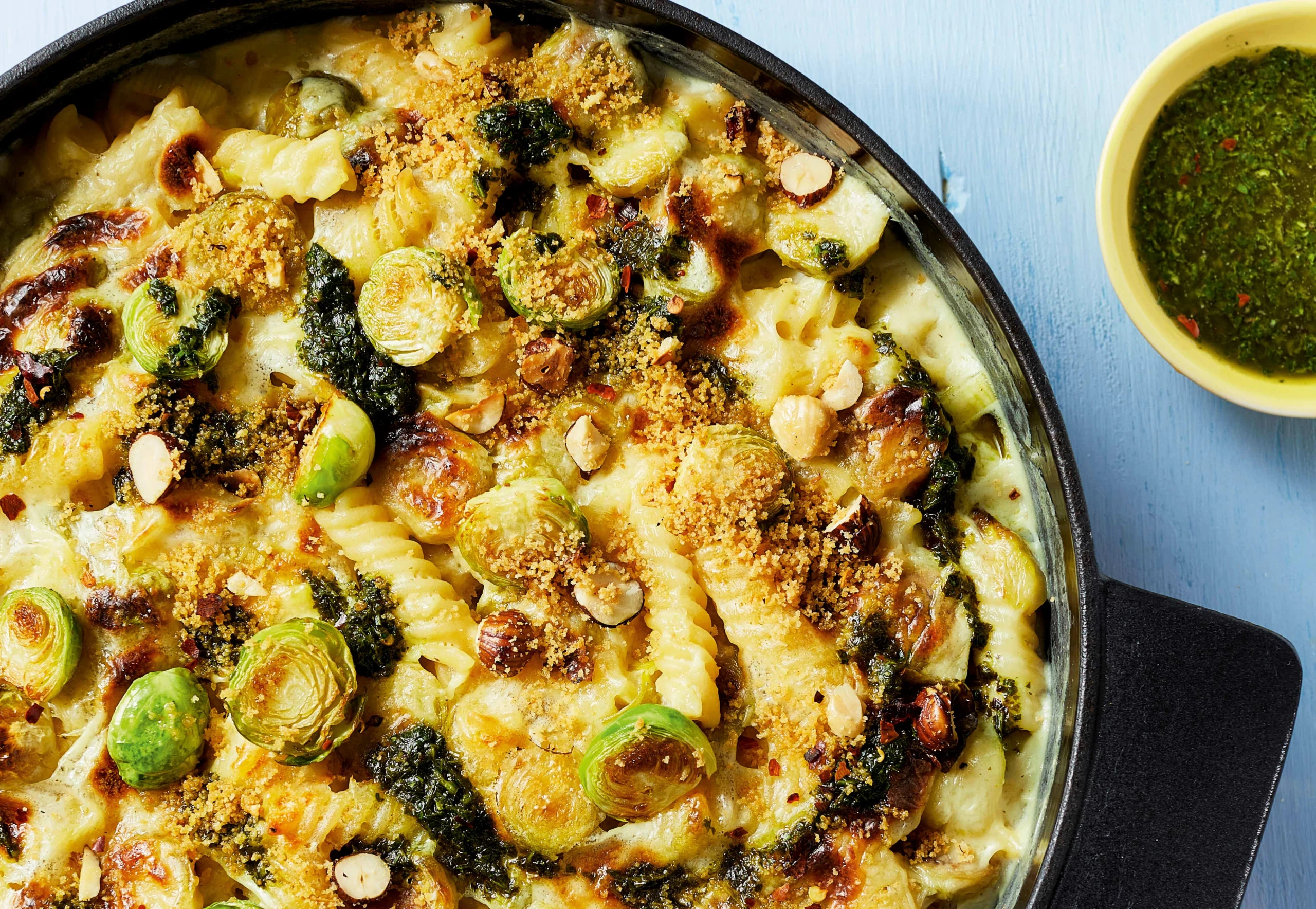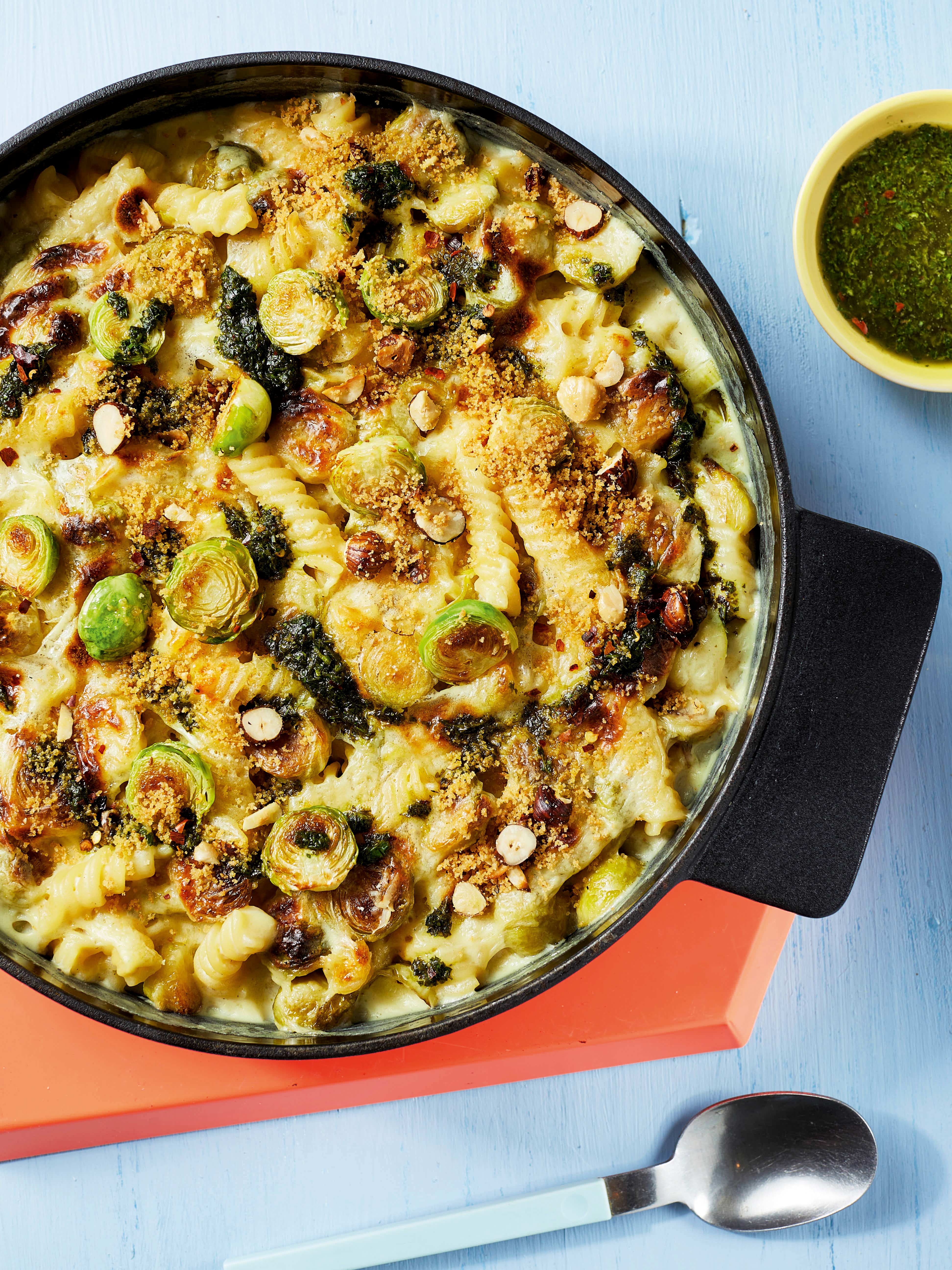 Cremige Ofen-Pasta mit Kohlsprossen, Haselnuss-Crunch und Petersilöl