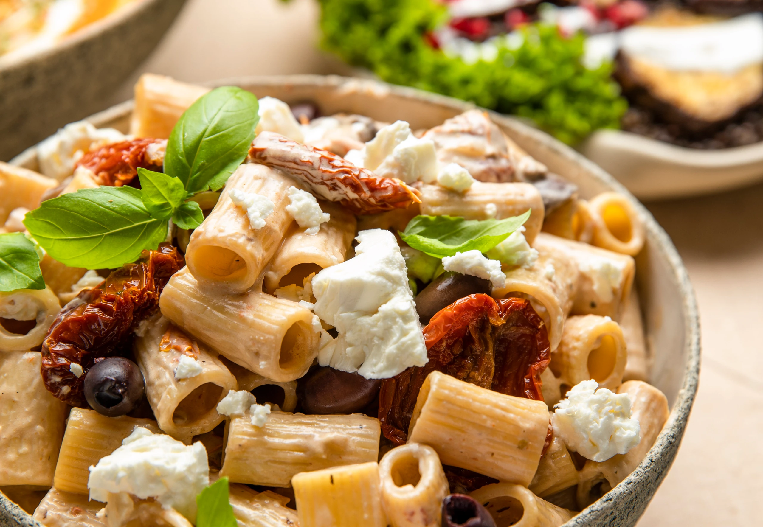 Zwiebel schälen und klein schneiden. Champignons putzen und je nach Größe halbieren oder vierteln. 3 EL Öl von den Paradeisern in einer großen Pfanne erhitzen. Zwiebel darin anschwitzen. Champignons und Paradeiser zugeben und ca. 10 Minuten anbraten. Paprikapulver und Ziegenfrischkäse unterrühren und mit Obers aufgießen. Sauce aufkochen. Pasta, Knoblauch und Oliven unterrühren und mit dem Nudelwasser auflockern. Feta darüber bröseln.