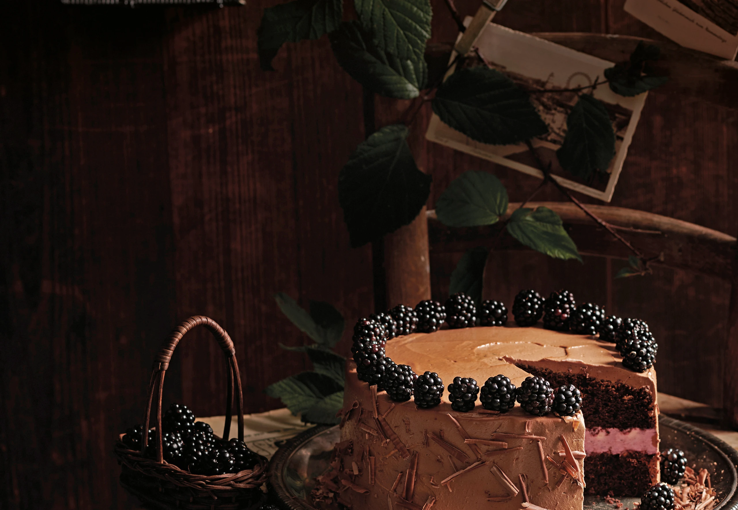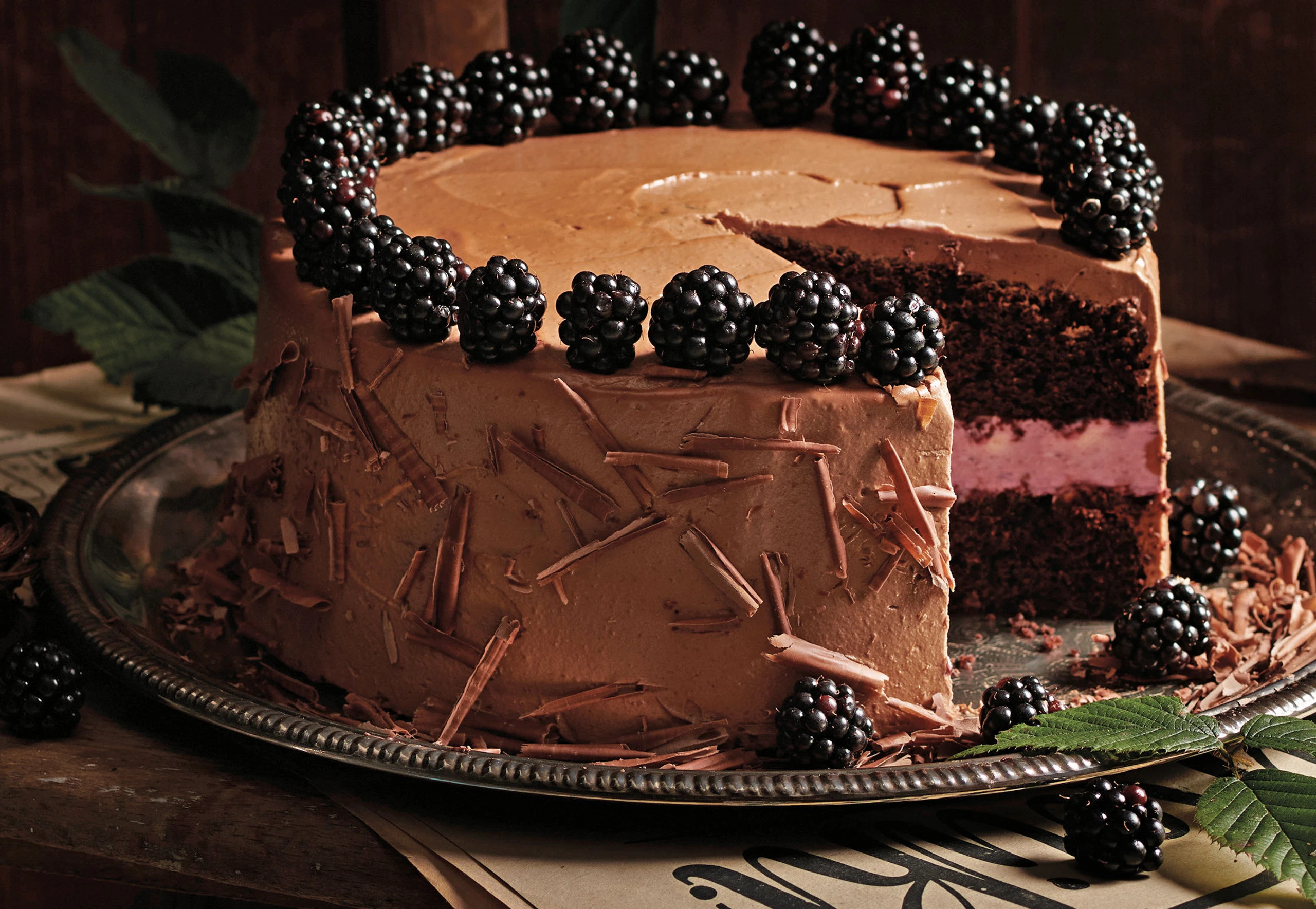 Brombeercreme auf einem Tortenboden verstreichen, dabei ca. 1 cm vom Rand aussparen. Zweiten Tortenboden darauf legen und leicht andrücken. Mit der Buttercreme rundum einstreichen. Mit den Schokoraspeln verzieren. Torte für mind. 5 Stunden kühl stellen. 30 Minuten vor dem Servieren herausnehmen und mit den Brombeeren verzieren.