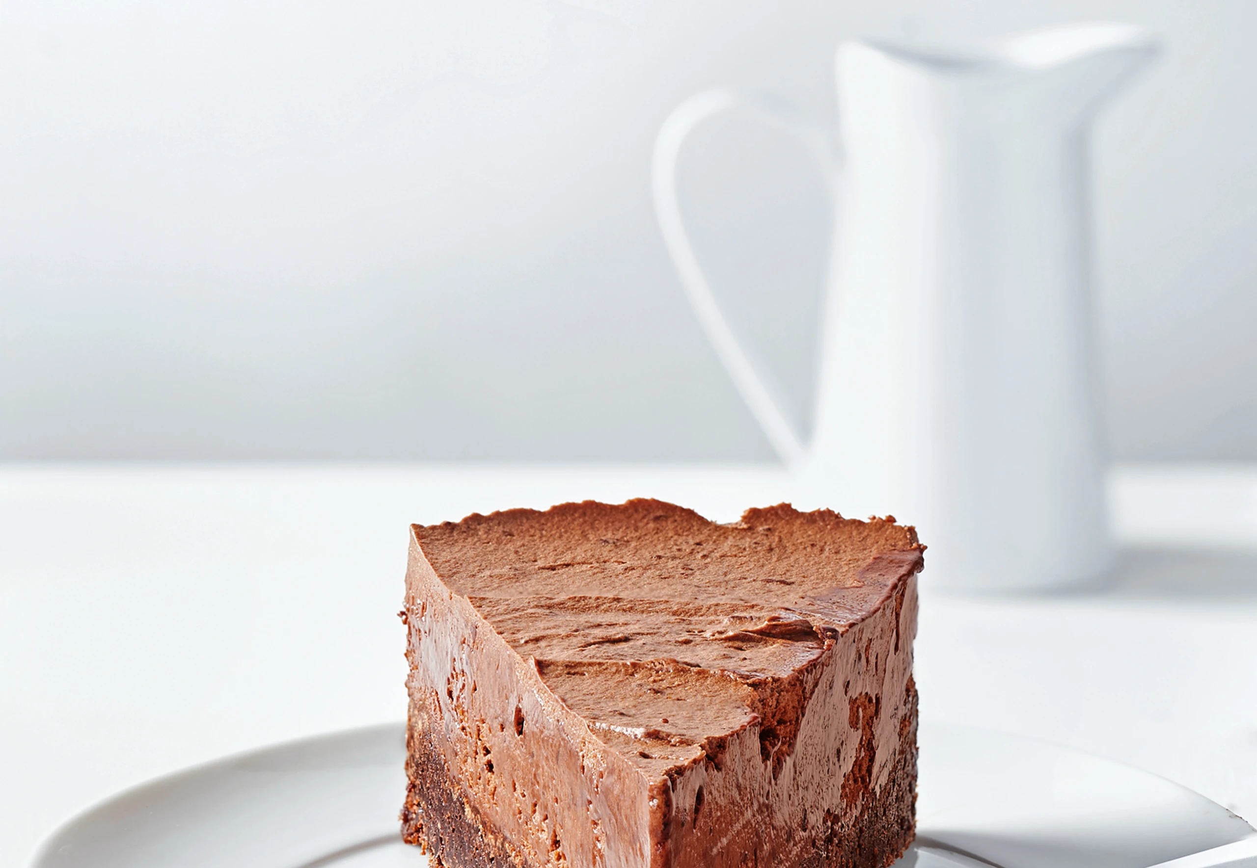 Schokomousse-Torte aus der Form lösen, Backpapier abziehen.