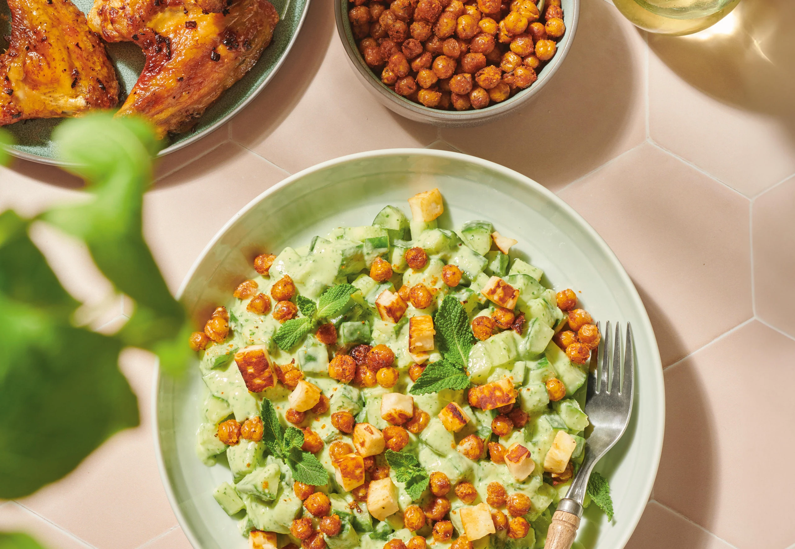 Gurkensalat mit Kichererbsen und Halloumi bestreuen, mit Minze garnieren.