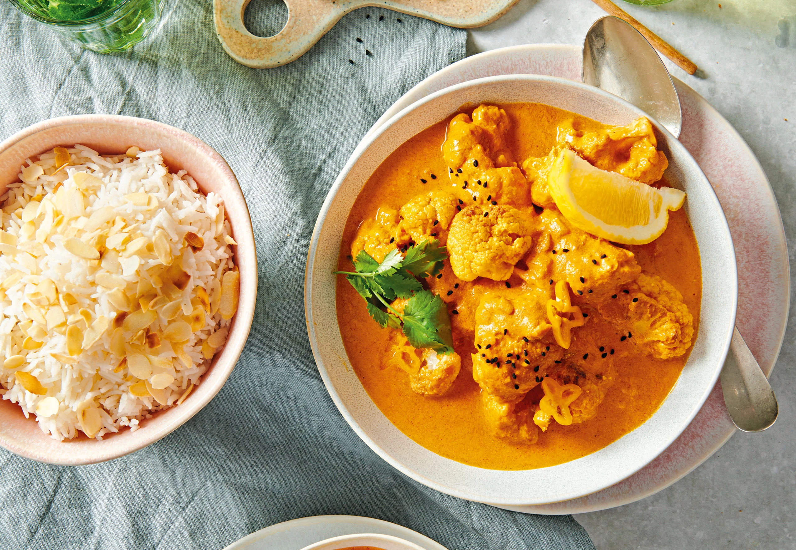 Kokos-Karfiol mit Zitronenspalten, Koriander, Schwarzkümmel und Mandelreis servieren.