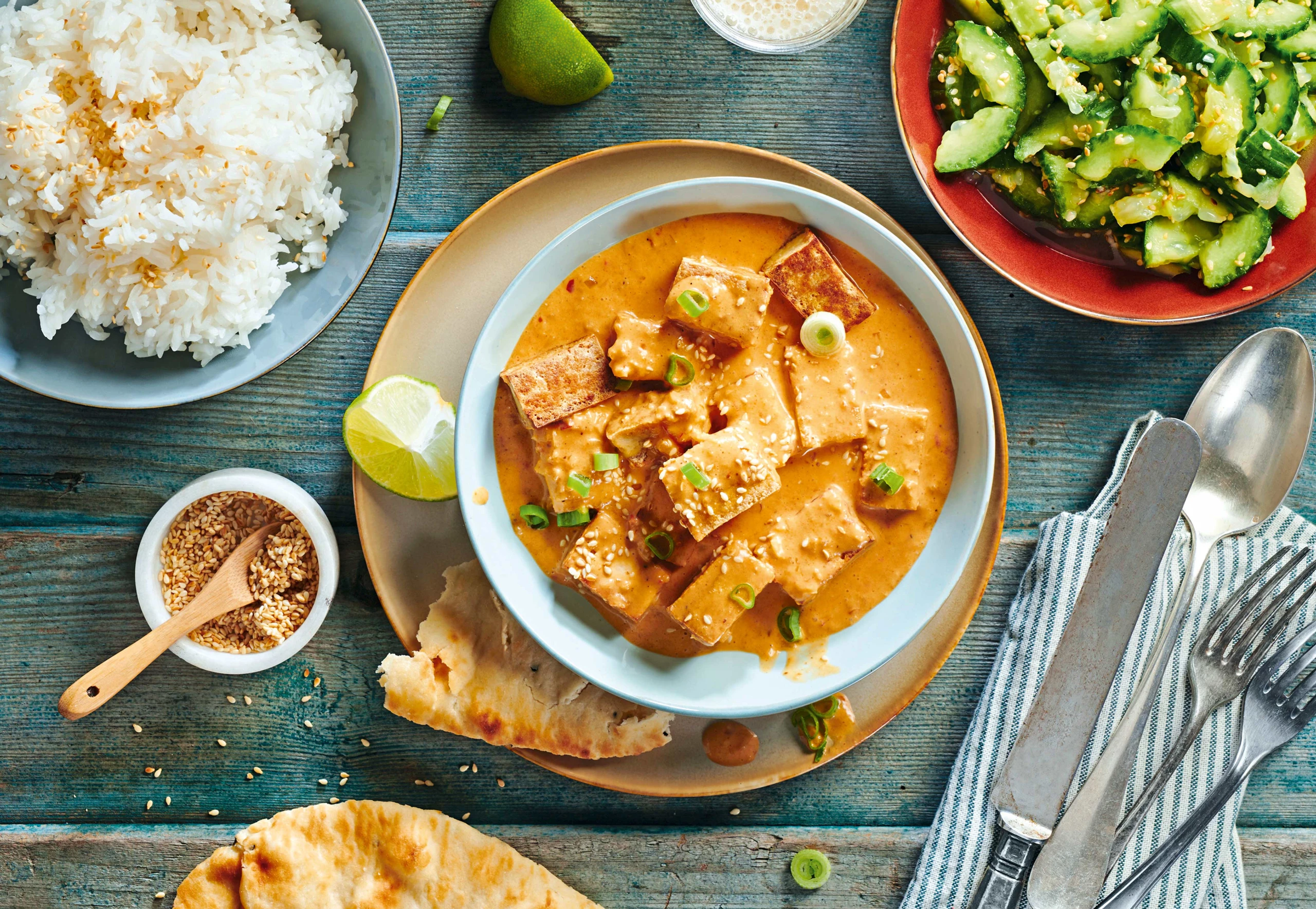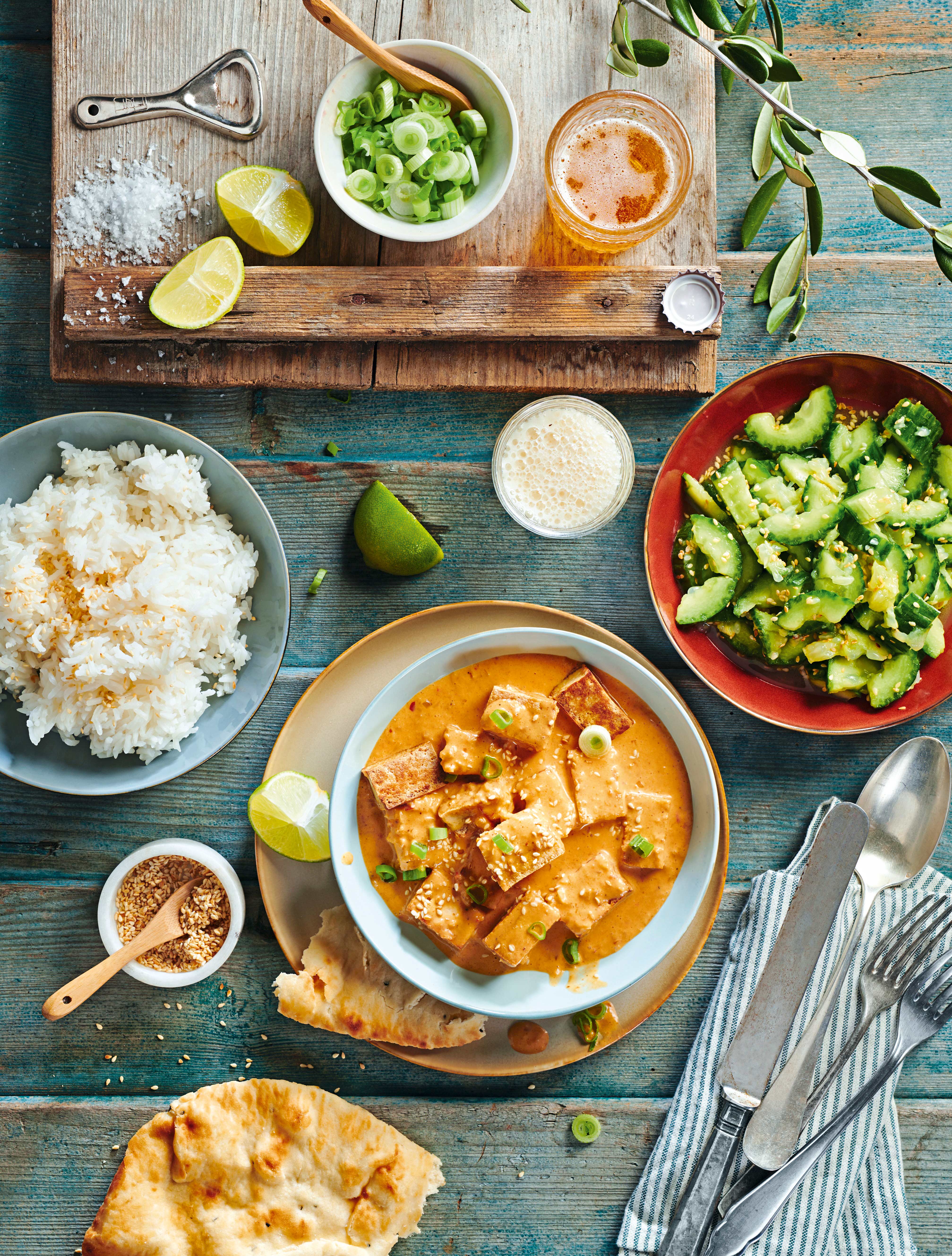 Cremiger Kokos-Tofu mit Sesam-Gurkensalat