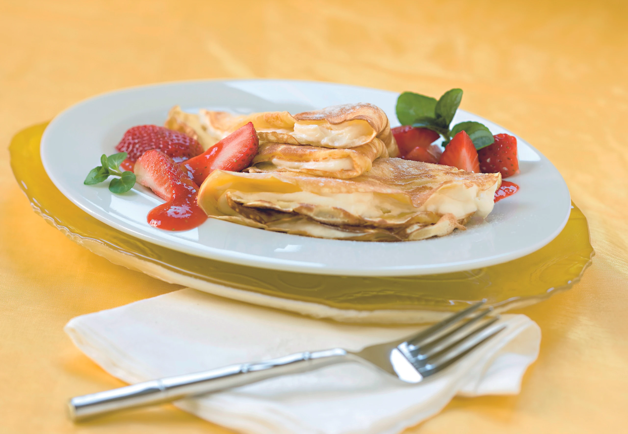 In einer Pfanne wenig Öl erhitzen. Aus dem Teig nacheinander 4 Crêpes darin backen. Crêpes mit der Fülle bestreichen und zu Dreiecken einschlagen. Mit Staubzucker bestreuen, mit Erdbeeren, Sauce und Minzeblättern garniert servieren.