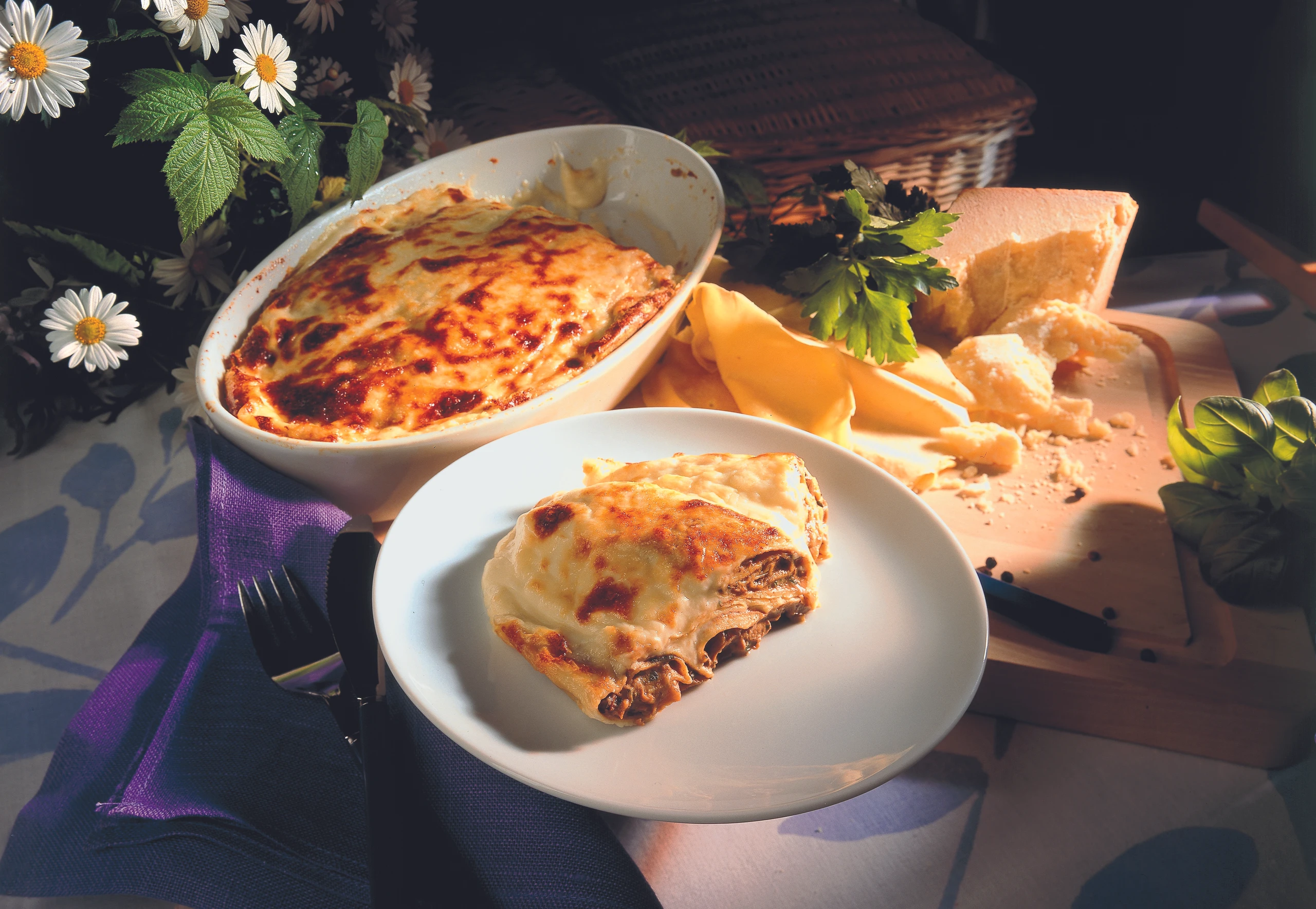 Eine feuerfeste, ovale Backform mit geschmolzener Butter ausstreichen. Mit einem weiteren Drittel der Bechamelsauce den Boden der Backform bestreichen. Die gefüllten Crêpes einschichten und mit der restlichen Bechamelsauce bestreichen. Oberfläche mit geriebenem Parmesan bestreuen.