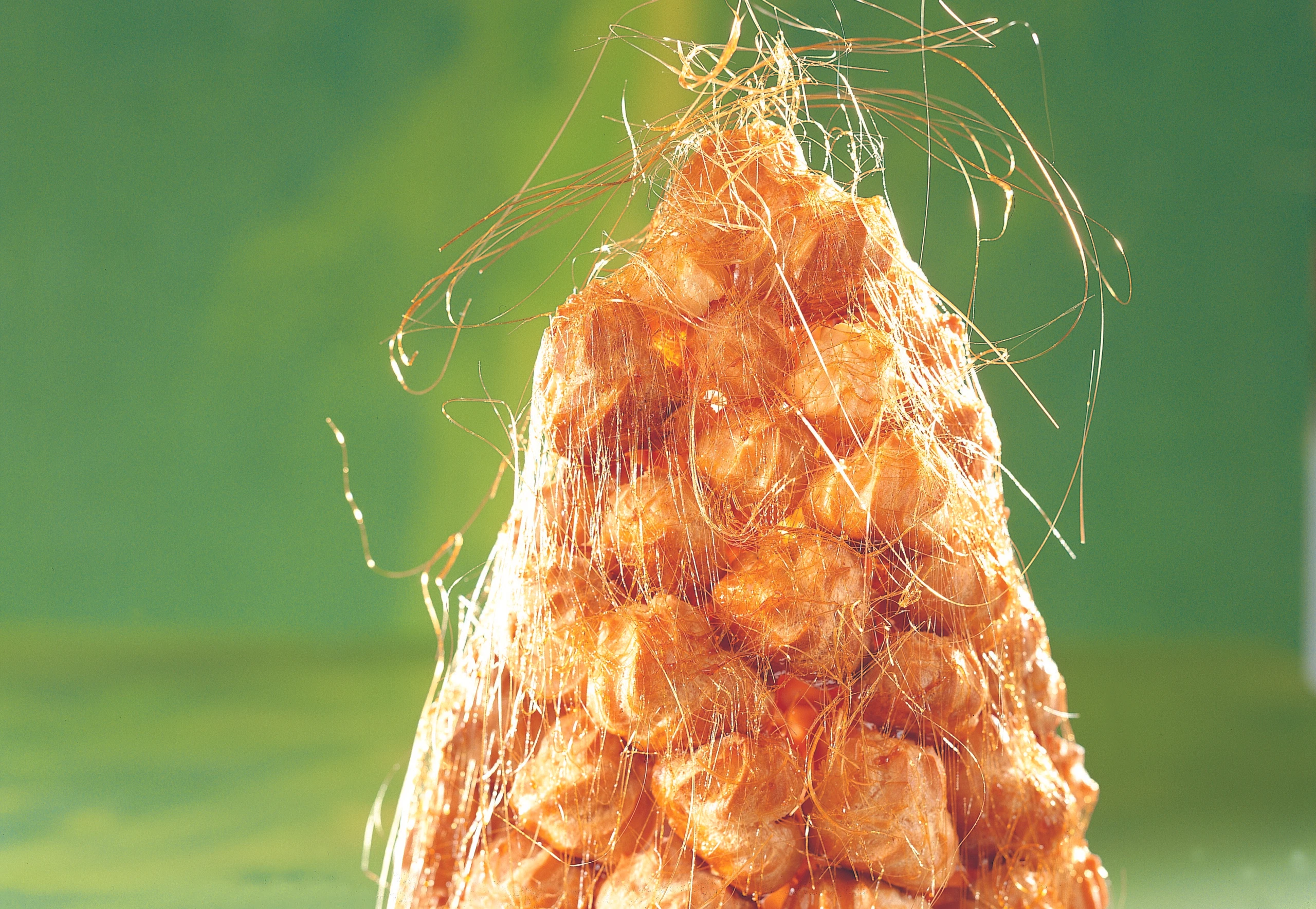 Creme in einen Dressiersack (Lochtülle) füllen und in die Krapferln spritzen. Krapferln in den Karamell tauchen und rundum den Kegel übereinanderschichten. Croquembouche mit Karamellfäden verzieren.