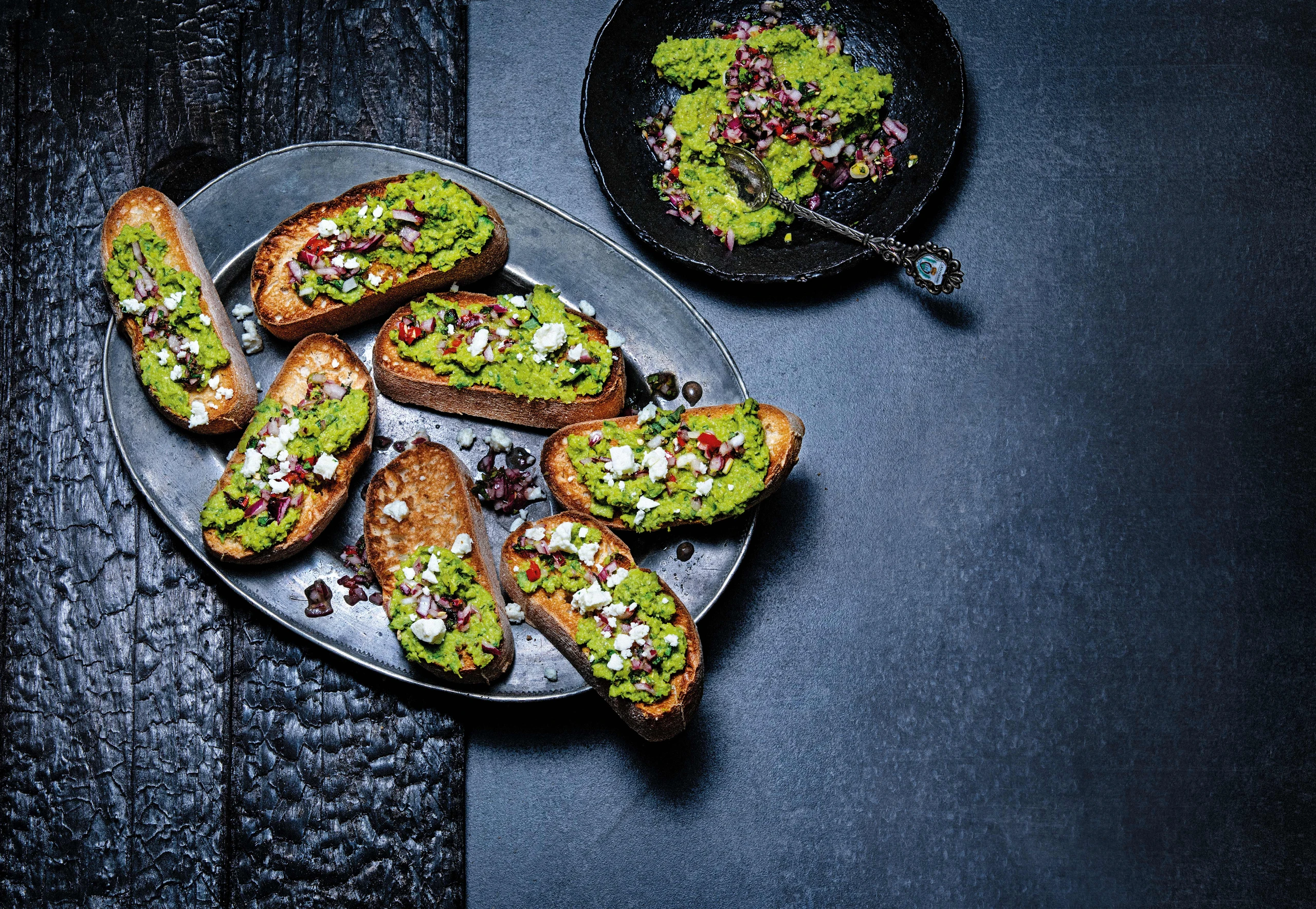 Crostini mit Erbsencreme, Feta und Chilisauce