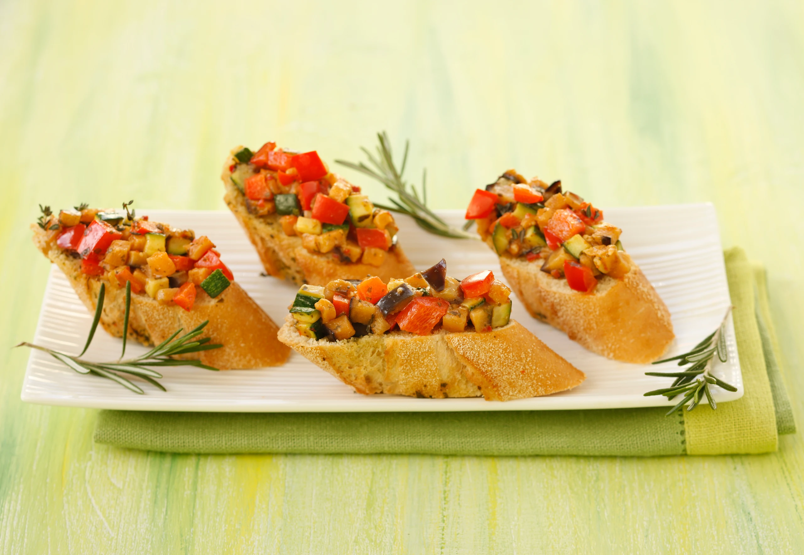 Backrohr auf 180°C vorheizen. Baguette nach Packungsanleitung zubereiten und in Scheiben schneiden (3 Scheiben pro Portion). Brote mit Balsamico beträufeln und das Gemüse darauf verteilen.
