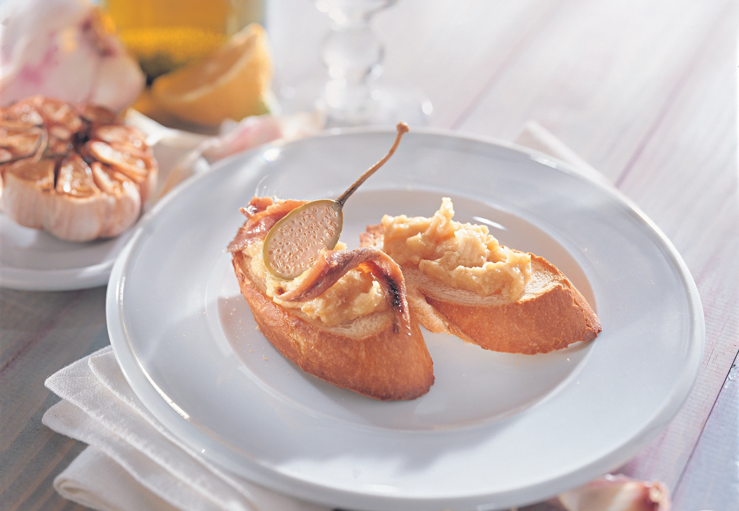 Baguette in Scheiben schneiden, im Rohr knusprig rösten und mit der Knoblauchcreme bestreichen. Crostini eventuell noch mit Sardellenfilets und Kapern belegen.