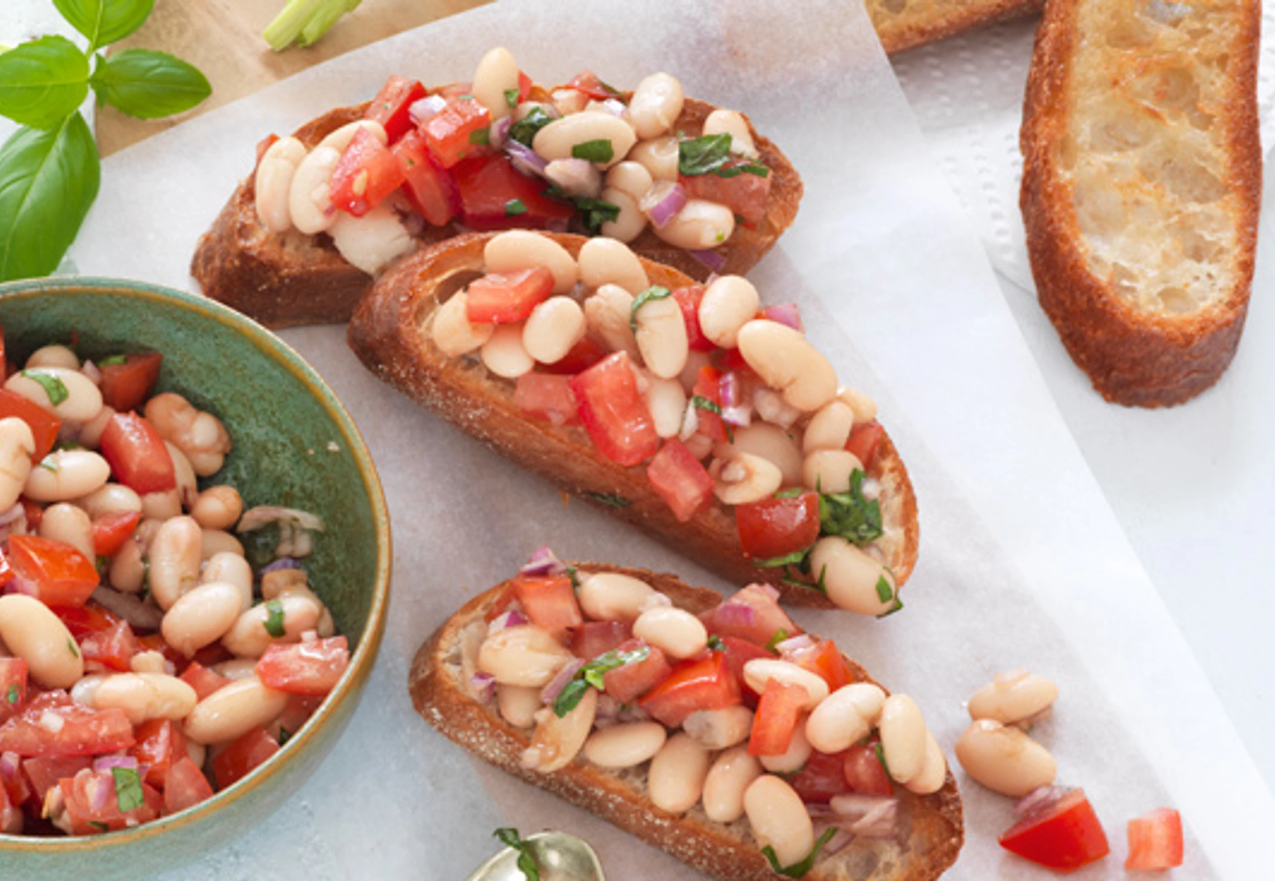 Paradeiser-Bohnenmischung auf den Broten verteilen. Crostini rasch servieren.