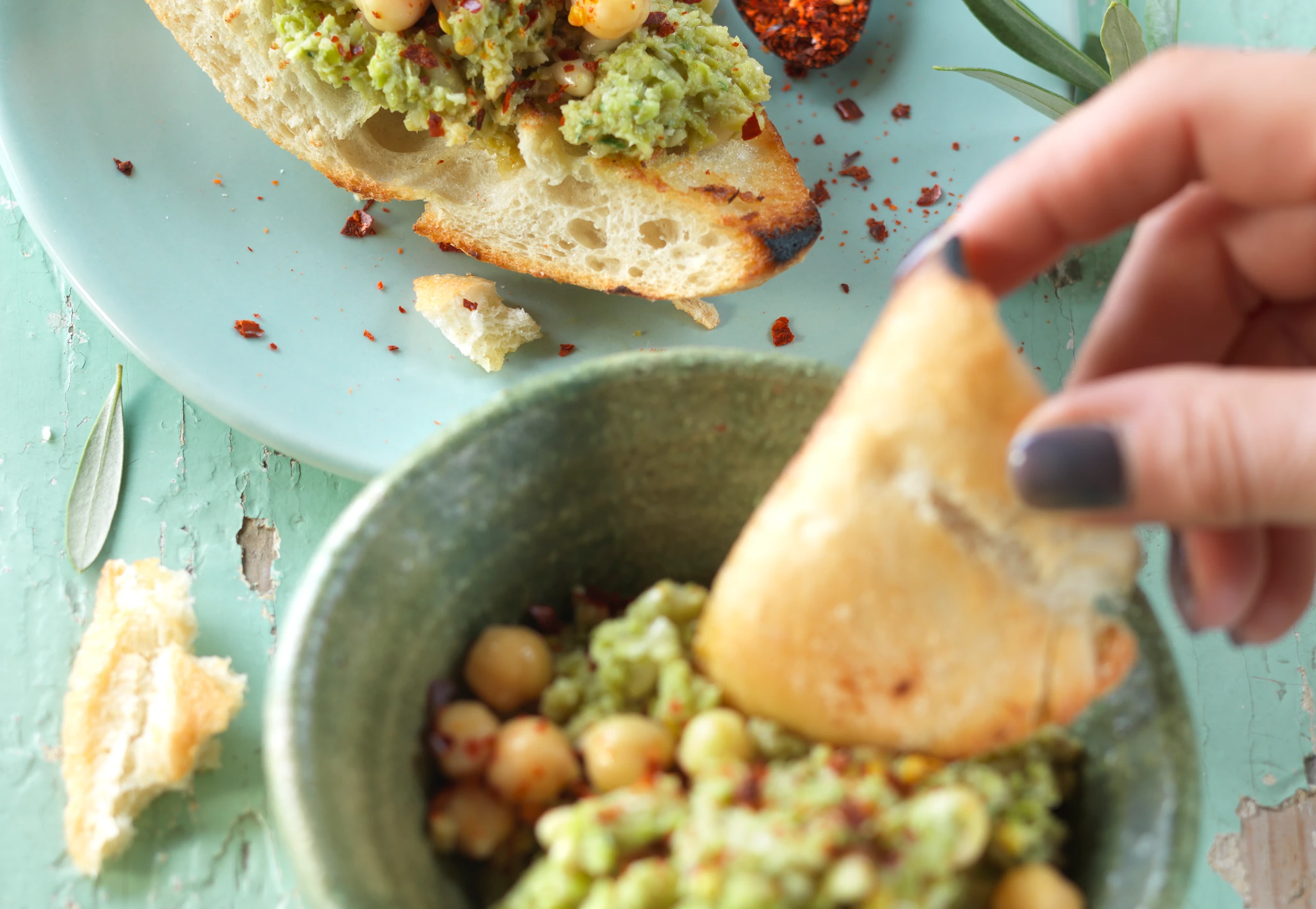 Brötchen mit Olivenpaste bestreichen, mit Chiliflocken bestreuen und mit den Kichererbsen servieren.