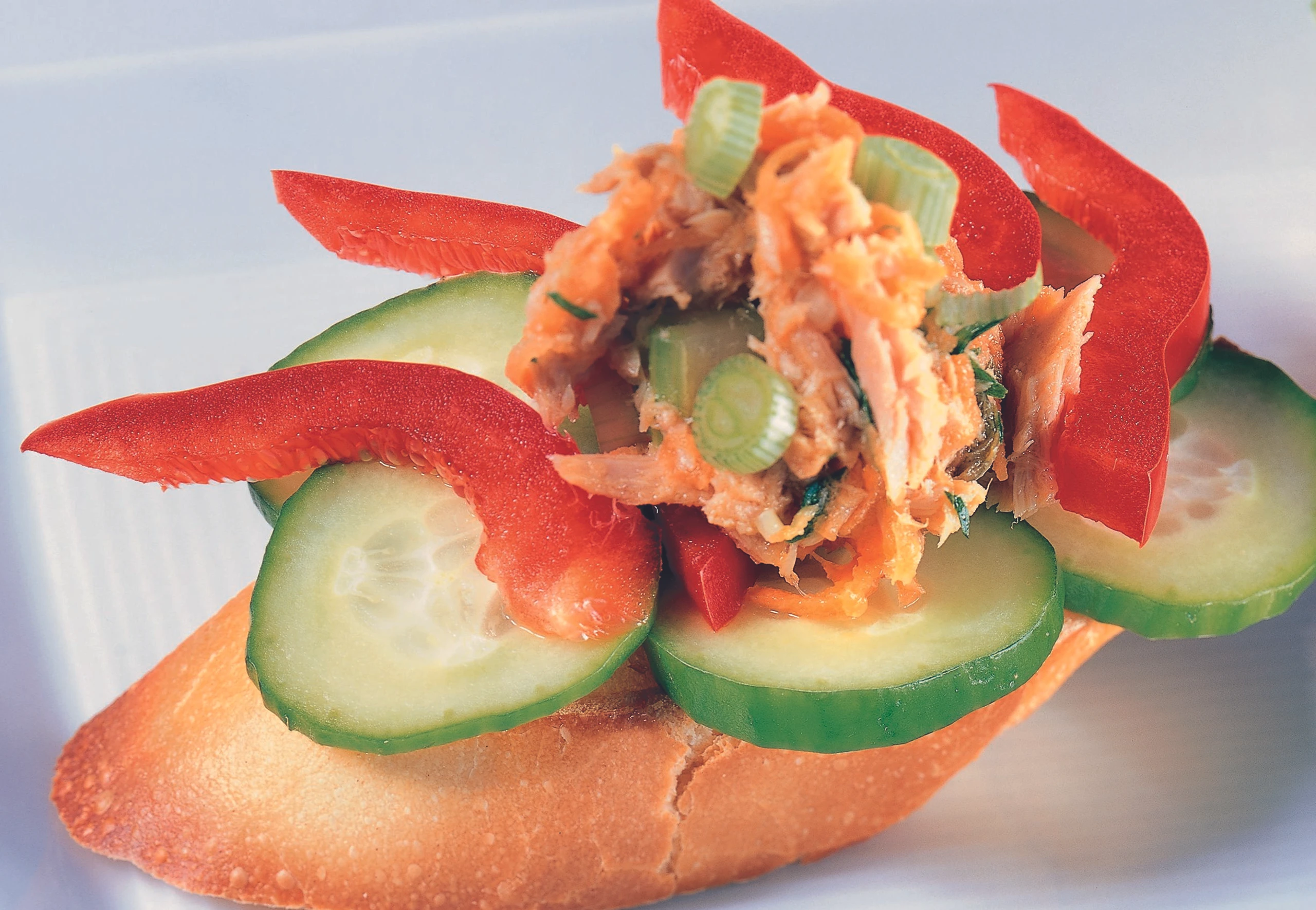 Baguette im Rohr goldbraun rösten, mit Gurkenscheiben belegen, Thunfischsalat darauf verteilen und mit Paprika garnieren.