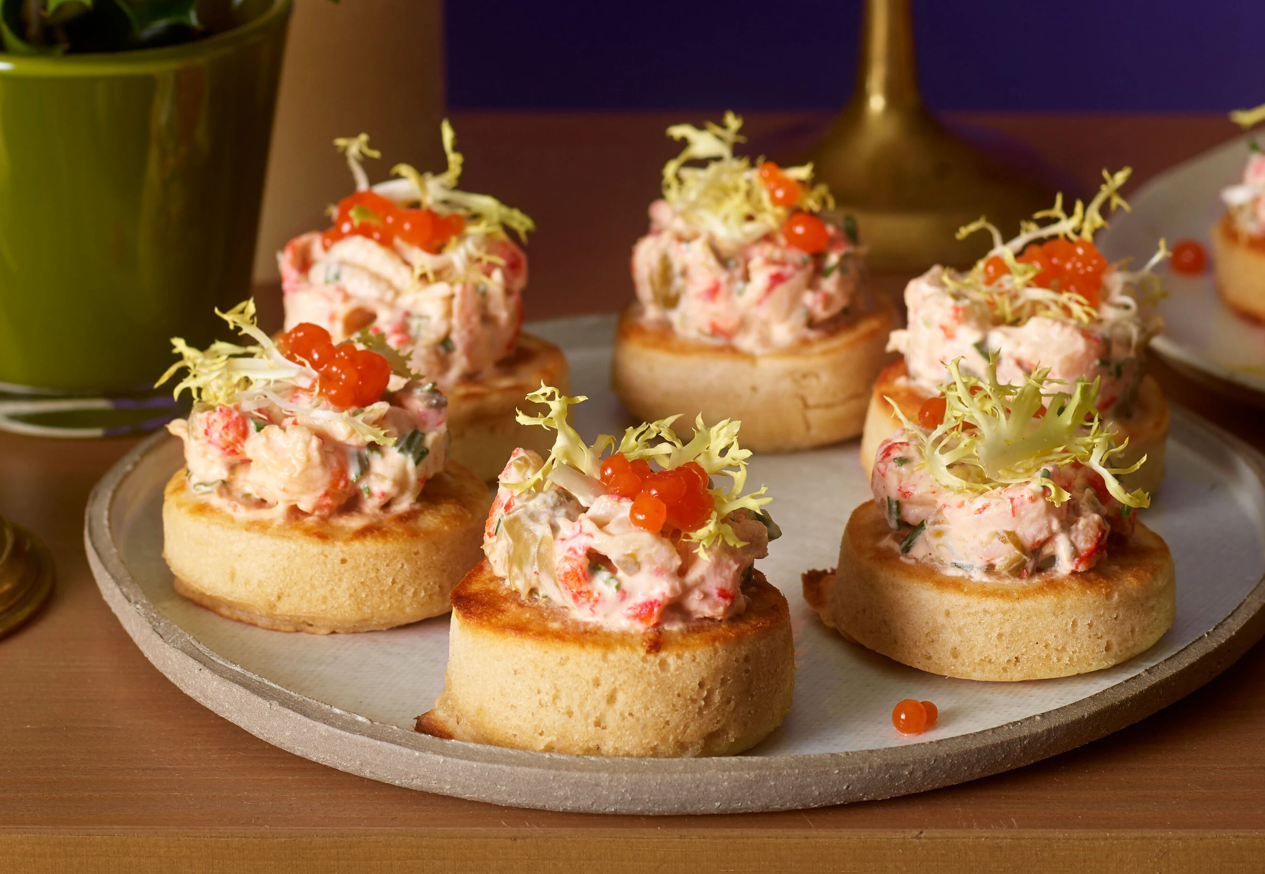 Crumpets mit Flusskrebs-Salat und Sriracha-Perlen