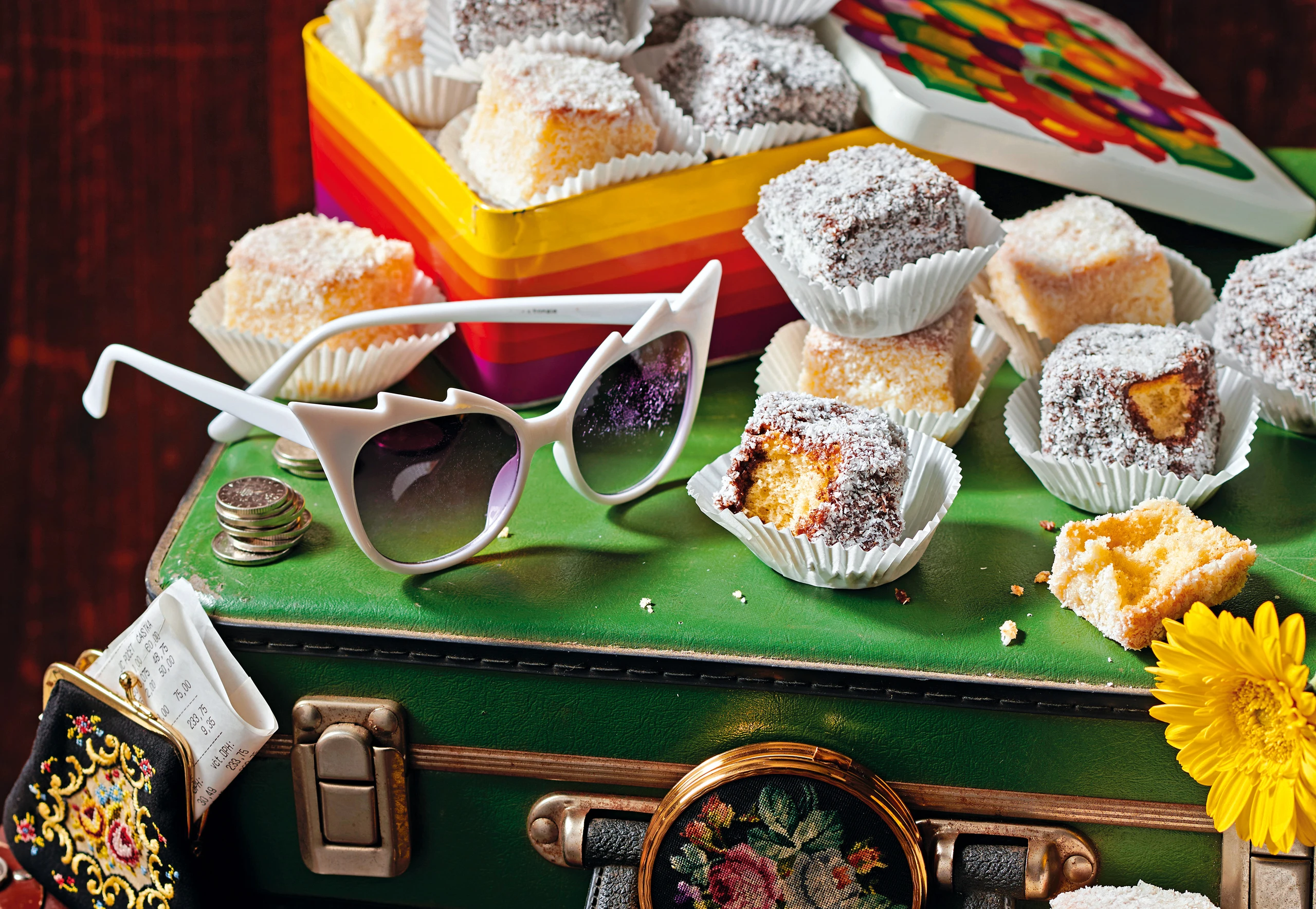 Die Hälfte der Würfel in die weiße Schokoglasur tunken, abtropfen lassen und in Kokosette wälzen. Übrige Kuchenwürfel in die dunkle Schokoglasur tunken, abtropfen lassen und in Kokosette wenden. Auf Backpapier trocknen lassen.