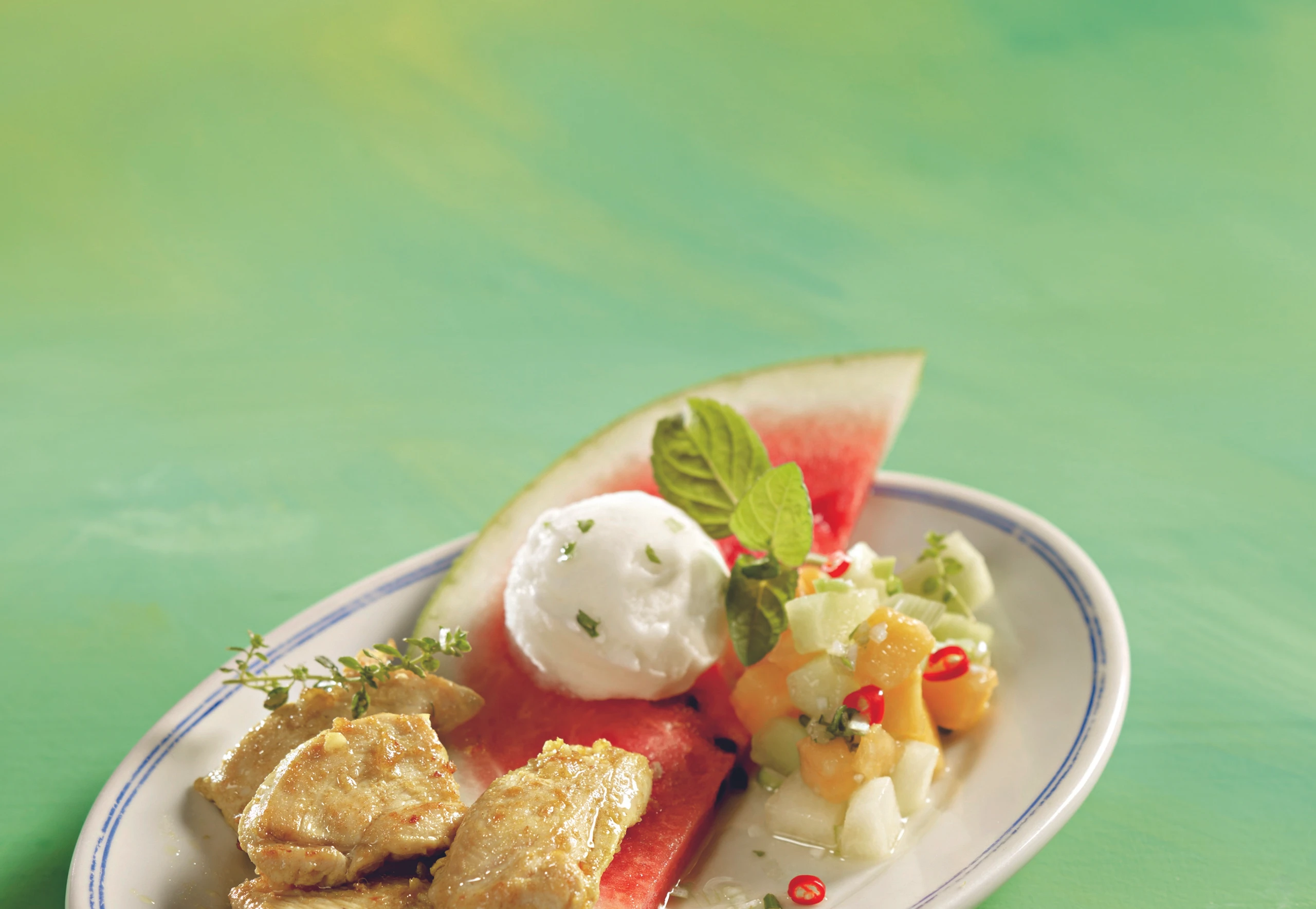 Wassermelonenscheiben mit Salsa, Sorbet und Hühnerstücken anrichten.