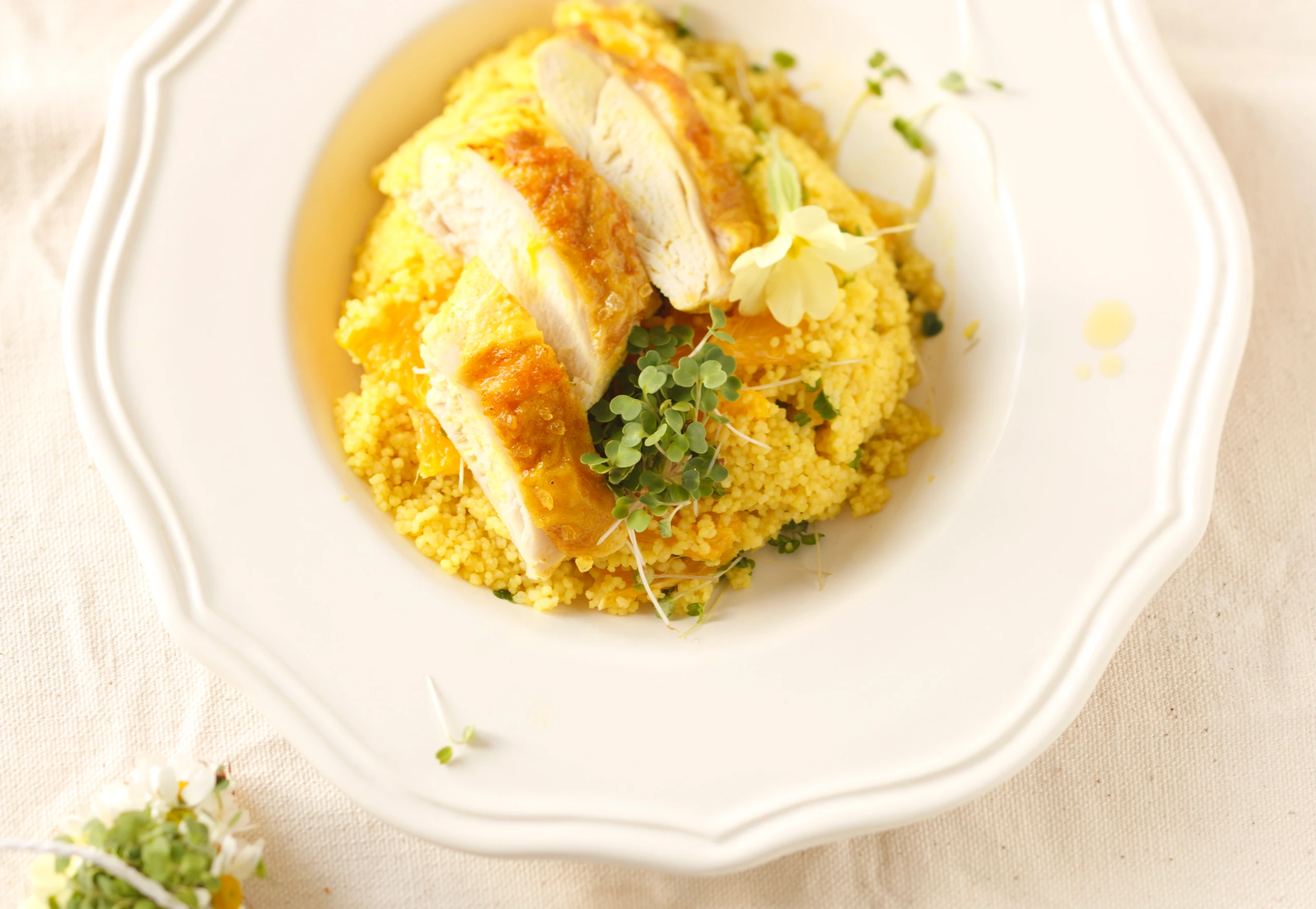 Huhn aus dem Rohr nehmen, in Scheiben schneiden und auf dem Couscous anrichten. Mit Kresse garnieren.
