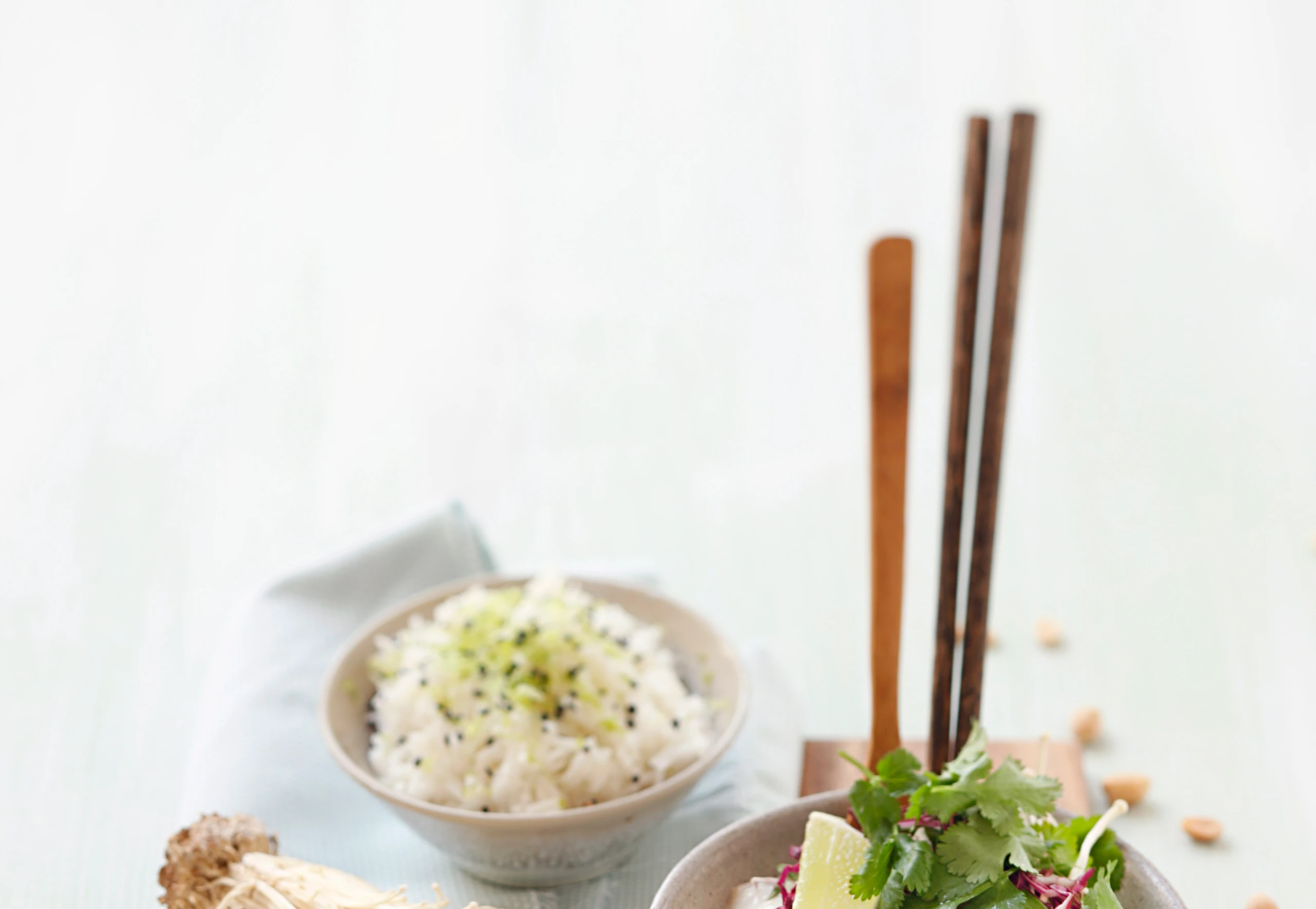 Koriander und Radicchio fein schneiden. Curry mit Sojasauce und Limettensaft abschmecken, mit Koriander, Nüssen, Limetten und Radicchio garnieren.