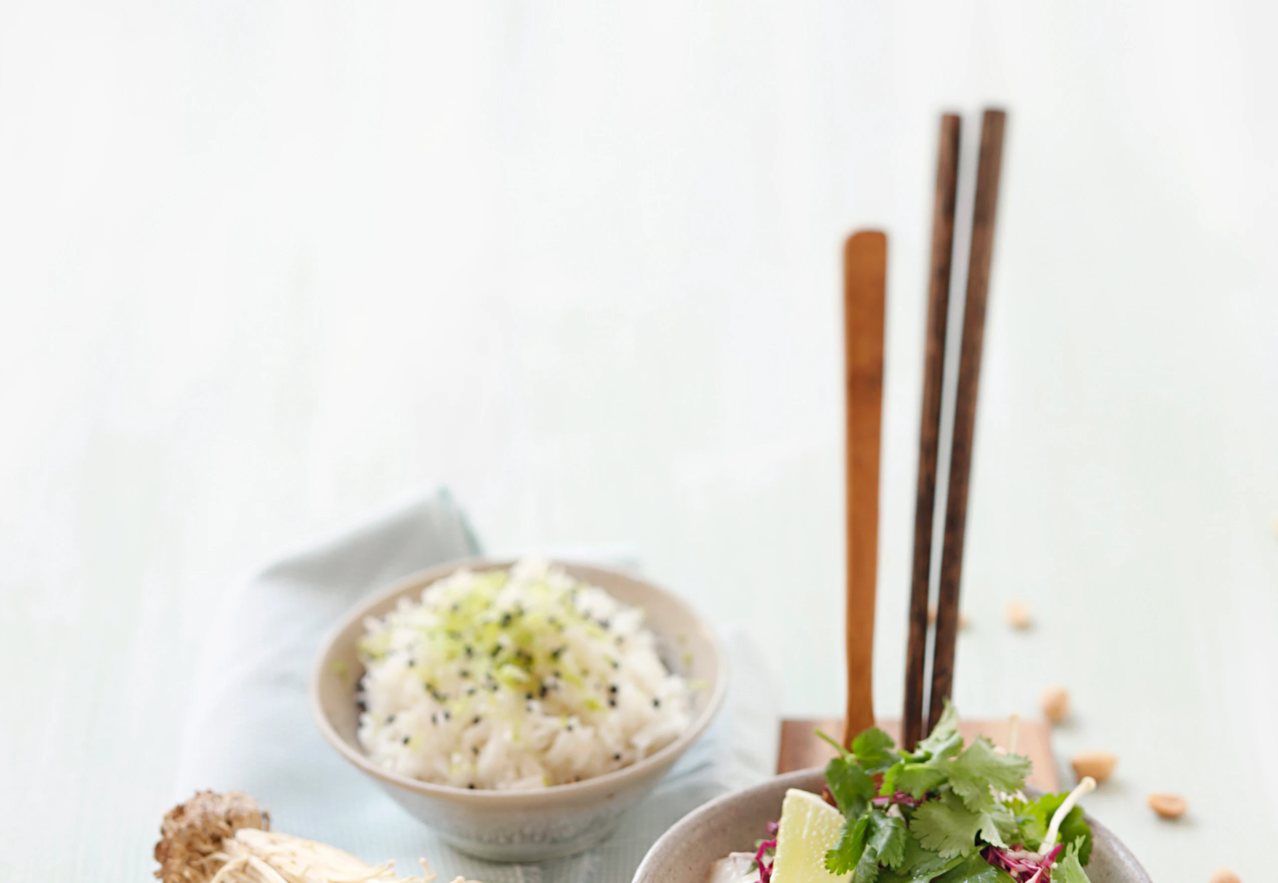Reis kurz trocken erhitzen, mit dem Wasser aufgießen und ca. 10 Minuten köcheln. Reis vom Herd nehmen und zugedeckt ca. 15 Minuten dämpfen. Die Hälfte der Limettenschale unterheben.